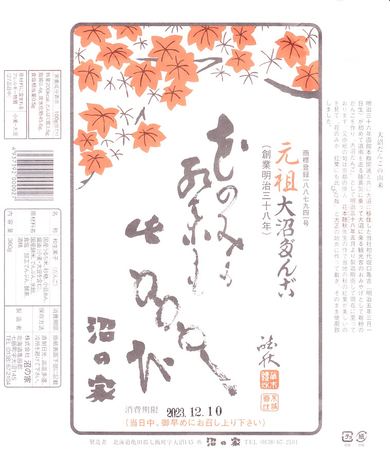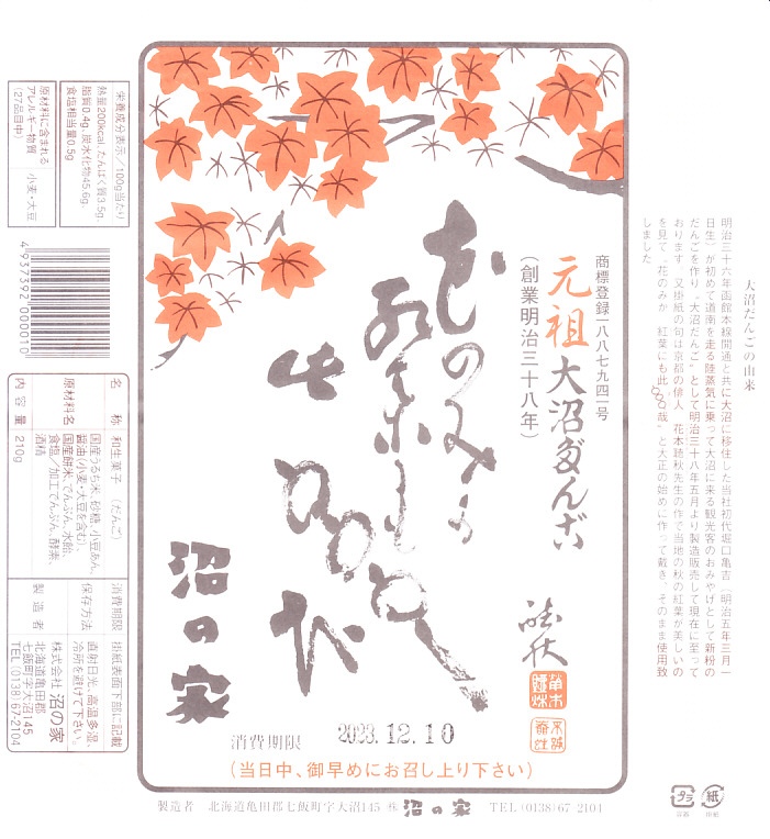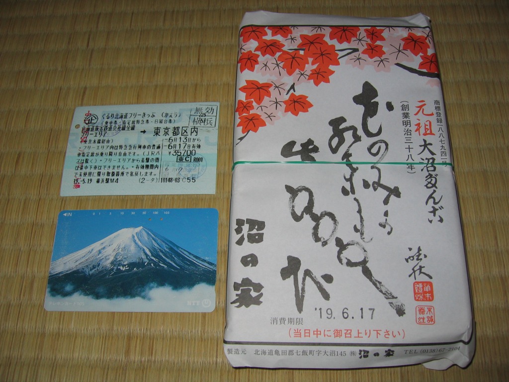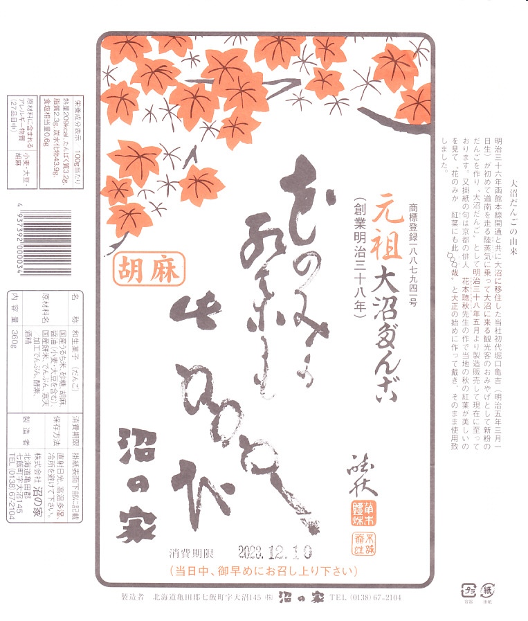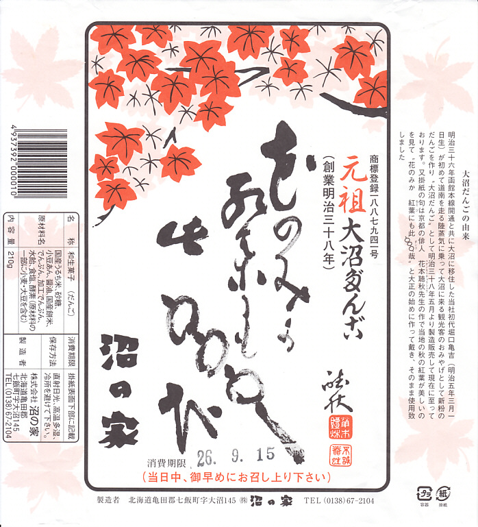 2007(平成19)年6月17日に購入した、大沼公園の駅売り銘菓の掛紙。絵柄は長らく変わらないが、法的な表示や注意書きに小変化が見られる。これは「小」のこしあん。価格は2007年当時で「小」が315円、「大」が525円。これを特急列車の車内販売で予約購入すると、「小」が350円となった。