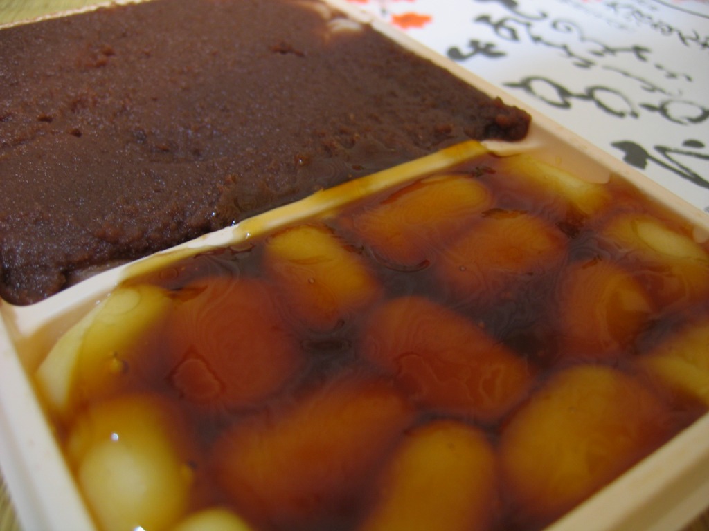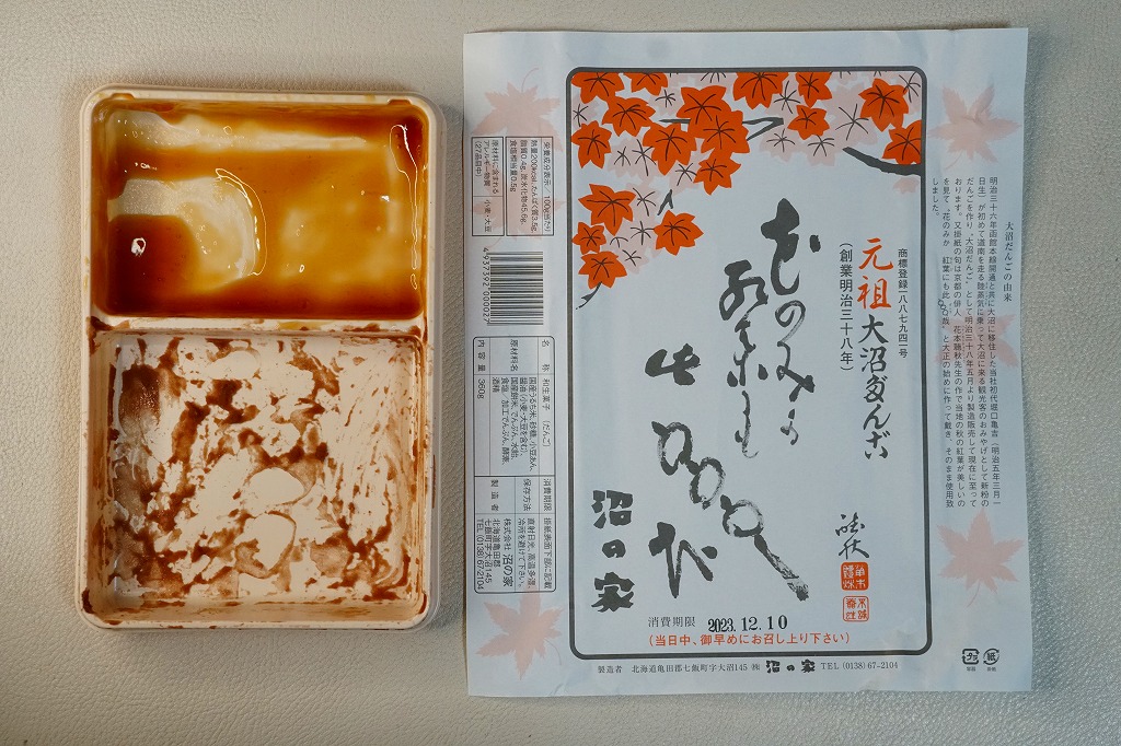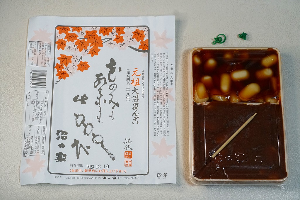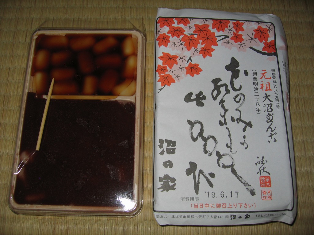 1905(明治38)年5月に発売したという鉄道銘菓で、大沼公園駅で長い間立ち売りが実施されたもの。軽食駅弁の大きさで、しかし厚さが約2センチしかない薄いプラ容器に、文字がとても読めない掛紙をかけて、輪ゴムでしばる。中身は小指の先ほどの団子の上に、容器の2/5は醤油だれを、3/5はこしあんまたは黒ごまをかけたもの。「大」と「小」、こしあんと黒ごまで、4種類が売られる。これは「小」のこしあん。