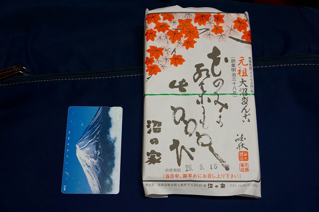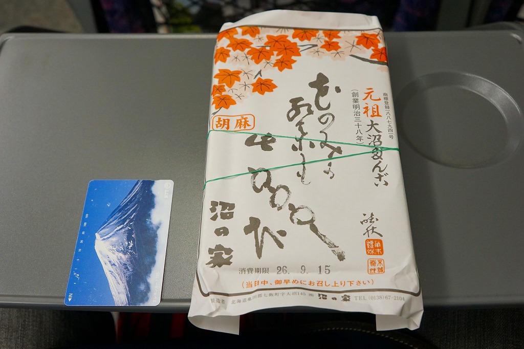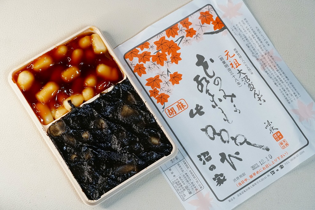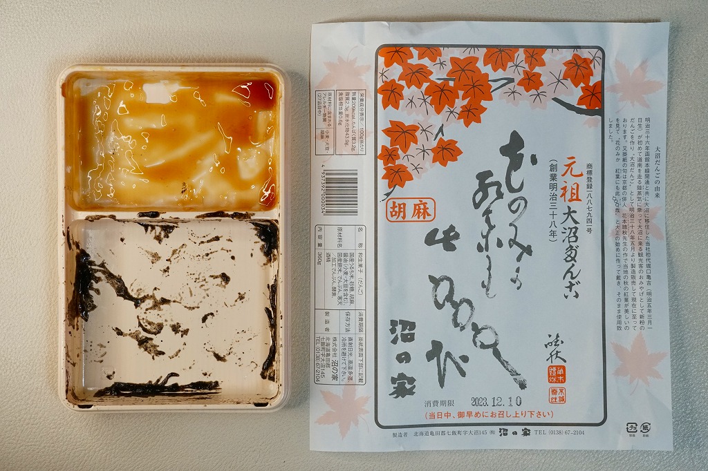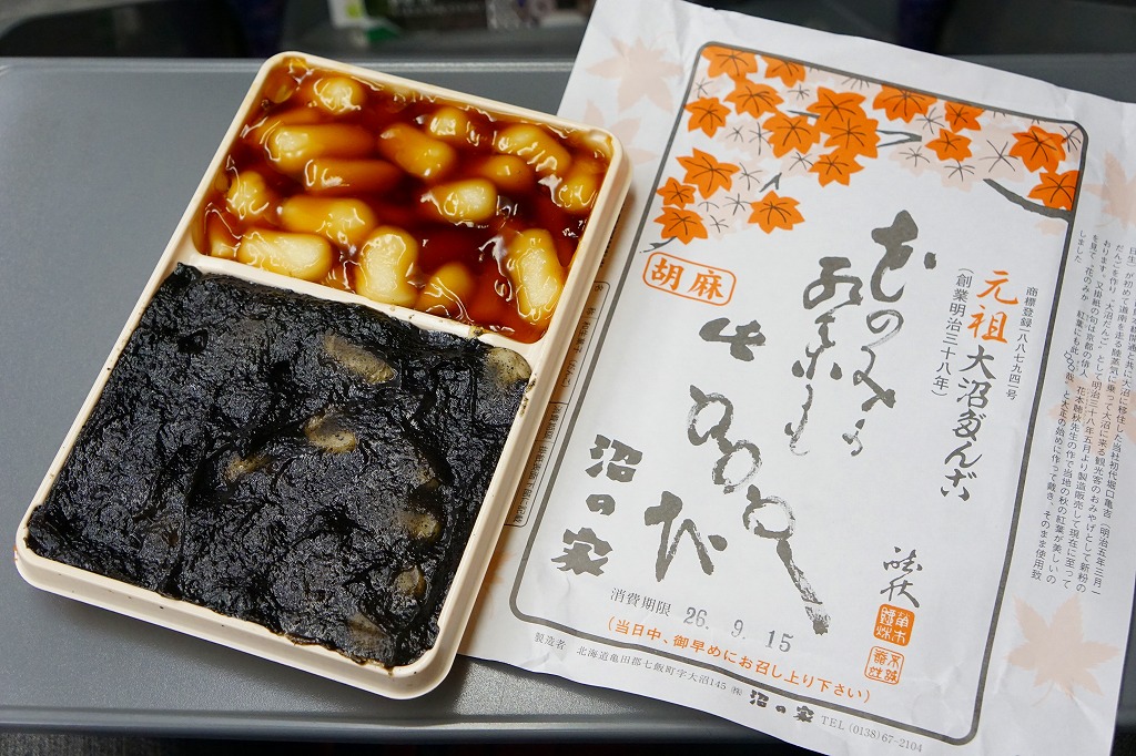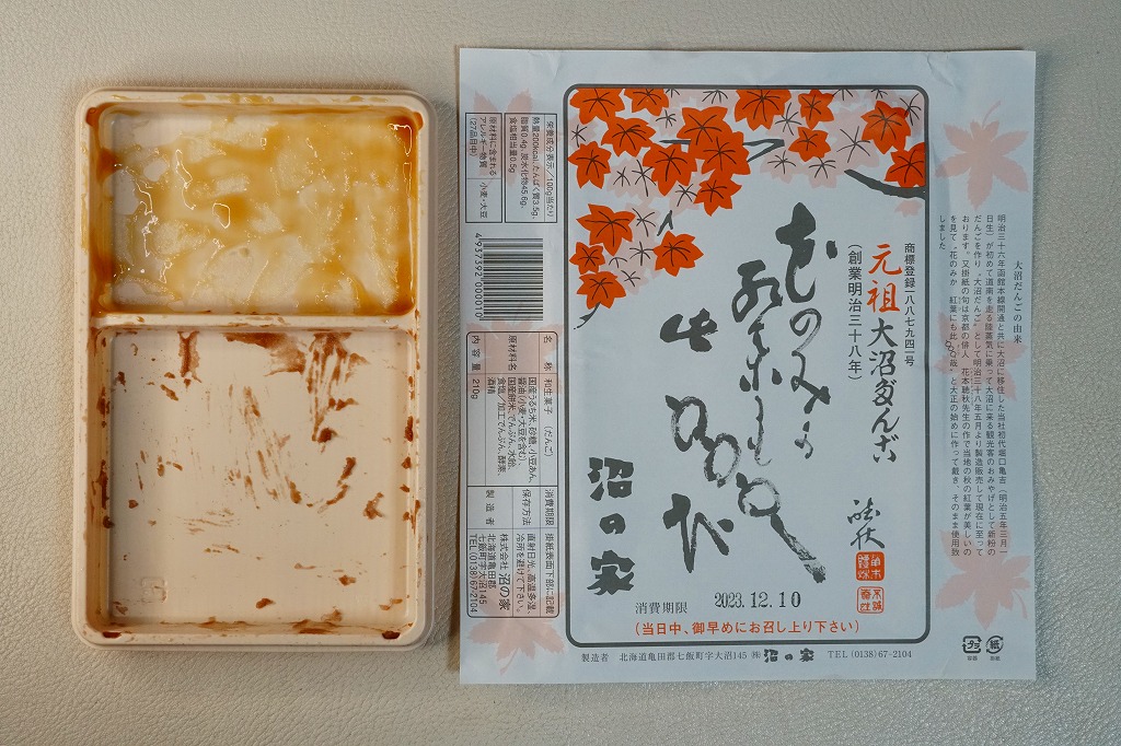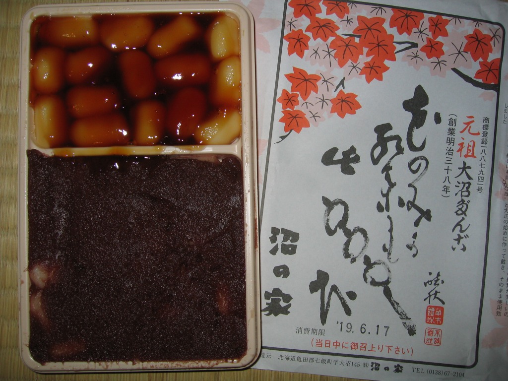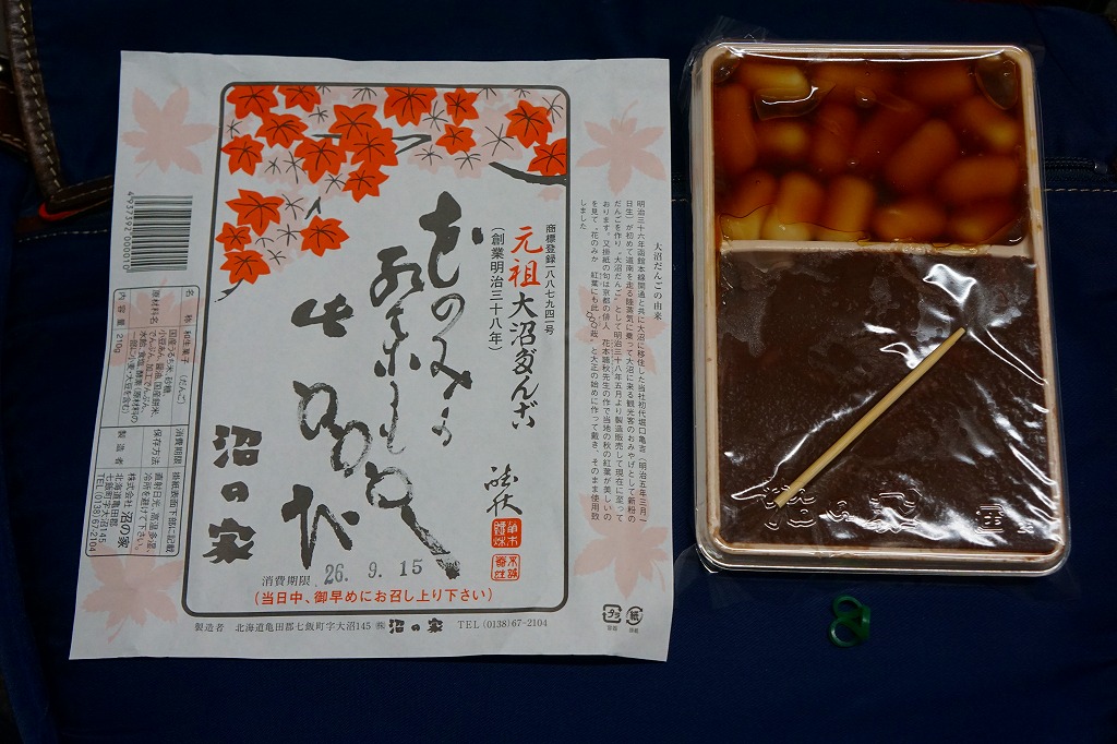 1905(明治38)年5月に発売したという鉄道銘菓で、大沼公園駅で長い間立ち売りが実施されたもの。軽食駅弁の大きさで、しかし厚さが約2センチしかない薄いプラ容器に、文字がとても読めない掛紙をかけて、輪ゴムでしばる。中身は小指の先ほどの団子の上に、容器の2/5は醤油だれを、3/5はこしあんまたは黒ごまをかけたもの。「大」と「小」、こしあんと黒ごまで、4種類が売られる。これは「大」の黒ごま。胡麻の味は個人的に格別。