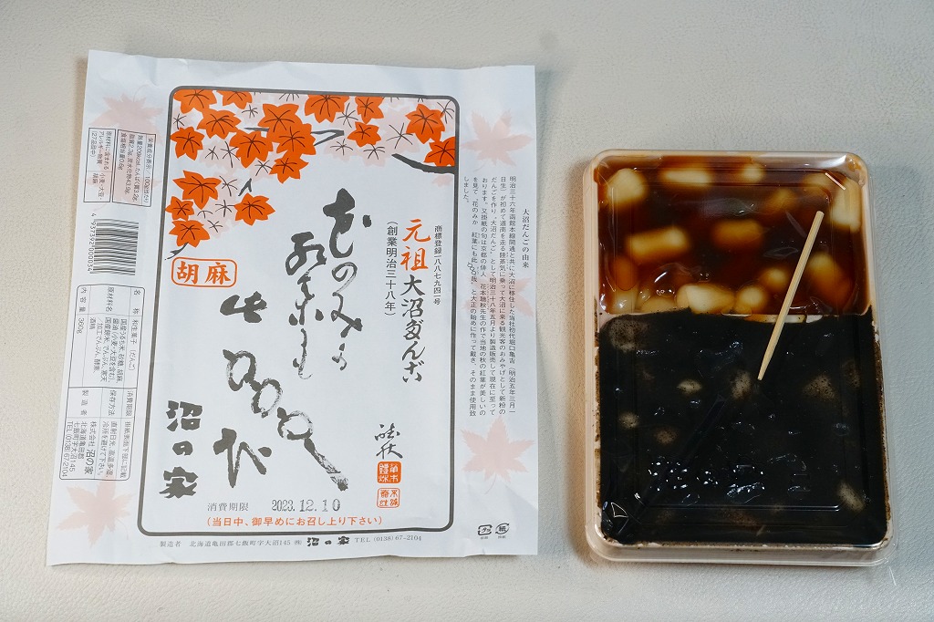 1905(明治38)年5月に発売したという鉄道銘菓で、大沼公園駅で長い間立ち売りが実施されたもの。軽食駅弁の大きさで、しかし厚さが約2センチしかない薄いプラ容器に、文字がとても読めない掛紙をかけて、輪ゴムでしばる。中身は小指の先ほどの団子の上に、容器の2/5は醤油だれを、3/5はこしあんまたは黒ごまをかけたもの。「大」と「小」、こしあんと黒ごまで、4種類が売られる。これは「小」の黒ごま。胡麻の味は個人的に格別。