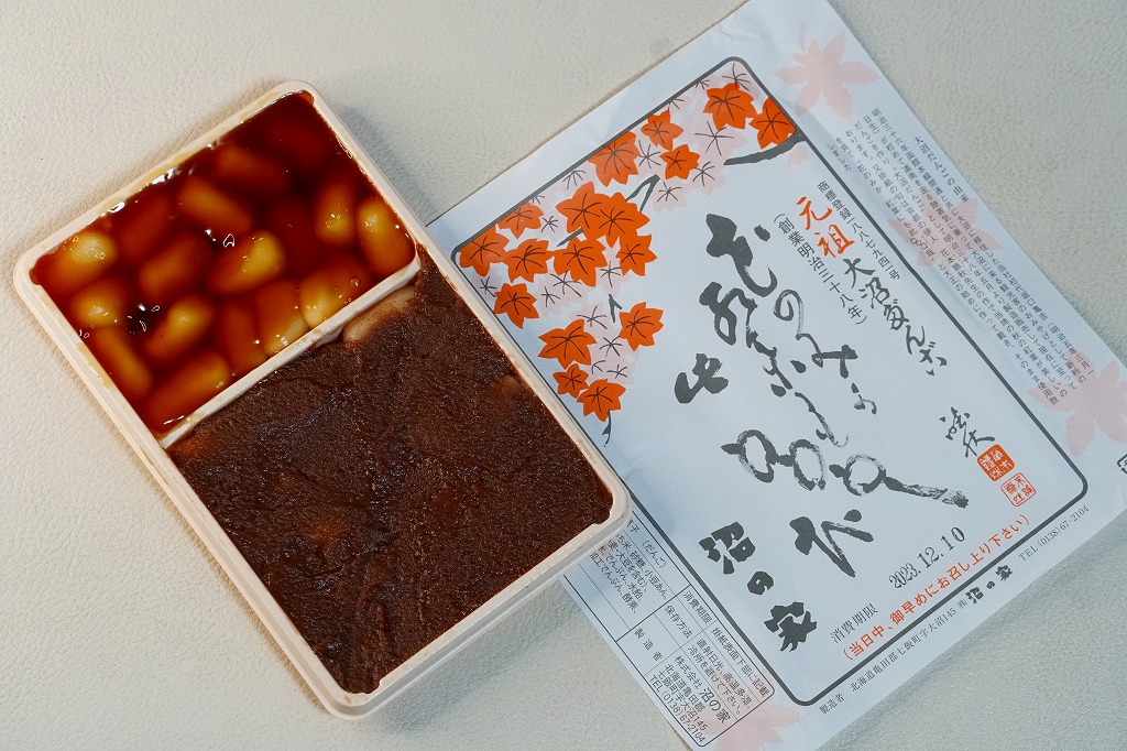 1905(明治38)年5月に発売したという鉄道銘菓で、大沼公園駅で長い間立ち売りが実施されたもの。軽食駅弁の大きさで、しかし厚さが約2センチしかない薄いプラ容器に、文字がとても読めない掛紙をかけて、輪ゴムでしばる。中身は小指の先ほどの団子の上に、容器の2/5は醤油だれを、3/5はこしあんまたは黒ごまをかけたもの。「大」と「小」、こしあんと黒ごまで、4種類が売られる。これは「大」のこしあん。