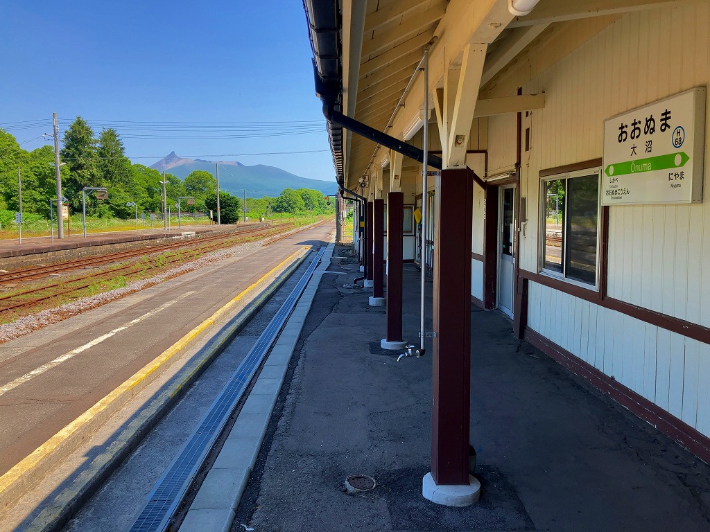 大沼公園駅の隣の駅。七飯町(ななえちょう)は北海道の南部にある、人口約2.7万人の農産地。内地や本州と蝦夷や北海道内を移動する陸路の途中にあり、開拓に加えて交通や戦争の歴史も刻まれるほか、鉄道の開通で大沼が観光地として発展した。大沼駅は地図や路線図を見る限り、函館本線が四方に分かれ道路も交わる要衝に見え、駅の規模も大沼公園駅より大きいが、町はまばらで客の利用も少なく、特急も止まらず、駅弁は第二次大戦の前後の一時期のみ売られた模様。大沼だんごも今はこの駅のものではない。1903(明治36)年6月28日開業、北海道亀田郡七飯町字大沼町。