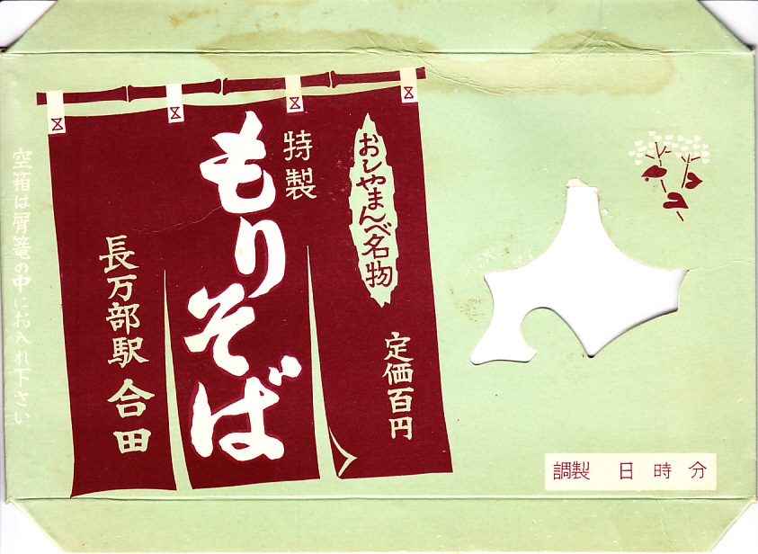 1960年代のものと思われる、昔の長万部駅弁のふた。「おしゃまんべ名物 特製 もりそば」の表記は、当時も今も変わらない。今は四角い背景が、当時は暖簾(のれん)だったことがわかる。