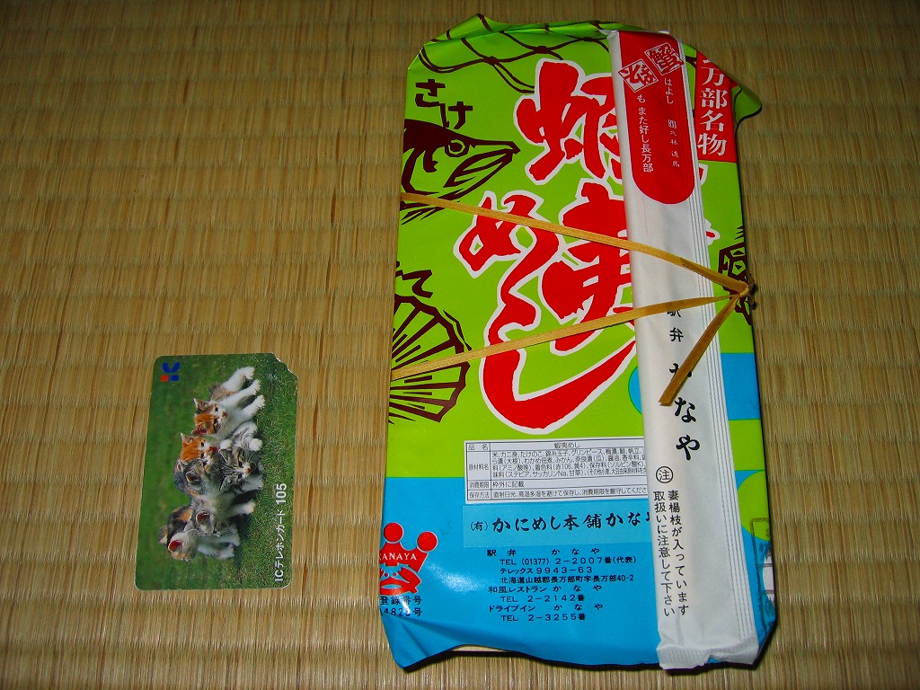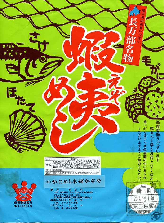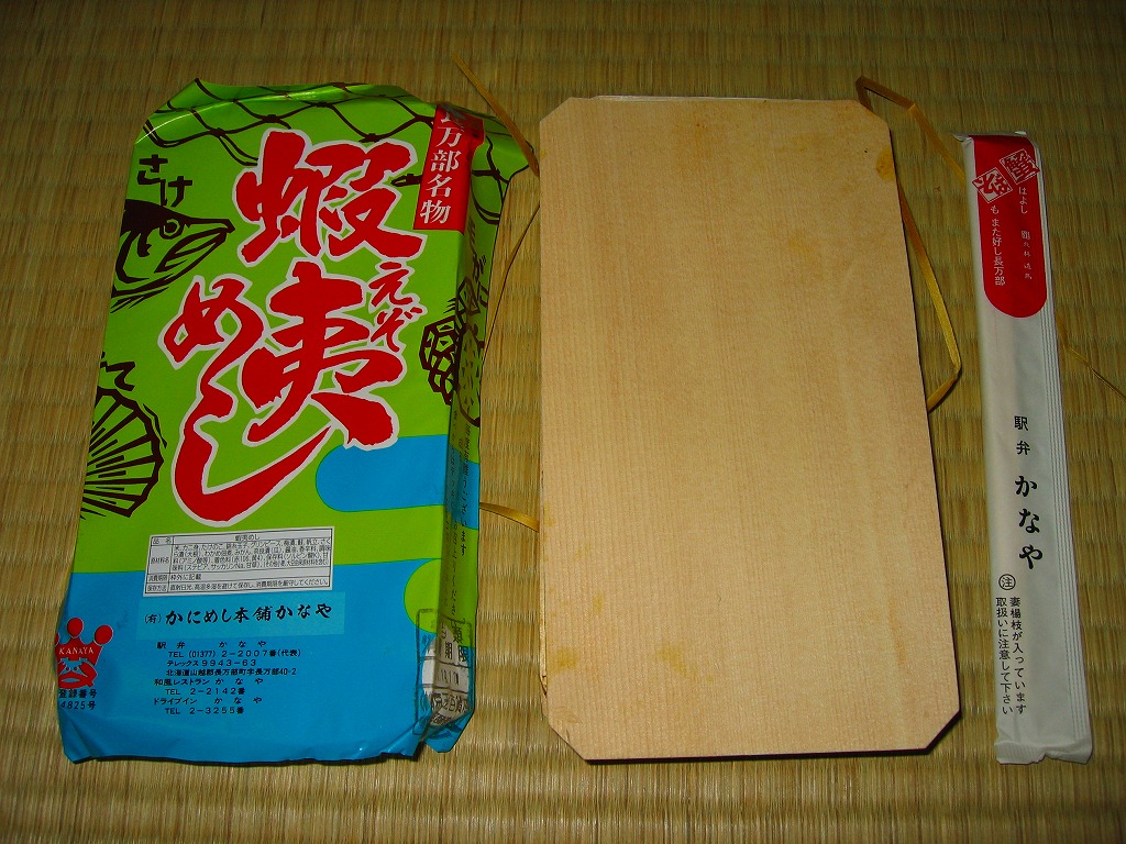 2004(平成16)年9月12日に購入した、長万部駅弁の箱。上記の16年後とおおむね同じで、中身も変わらない。当時は調製元のところに「JR旅客構内中央会会員」の表記があった。
