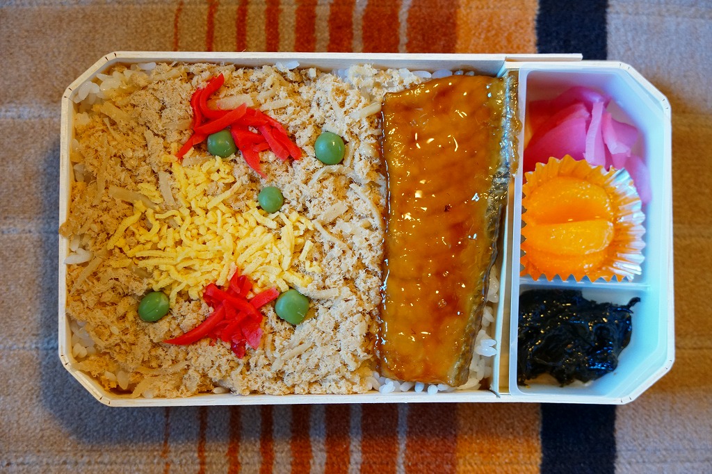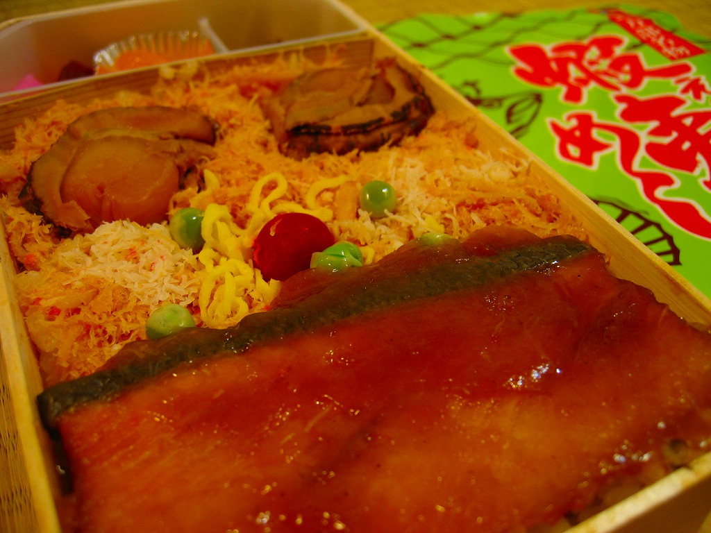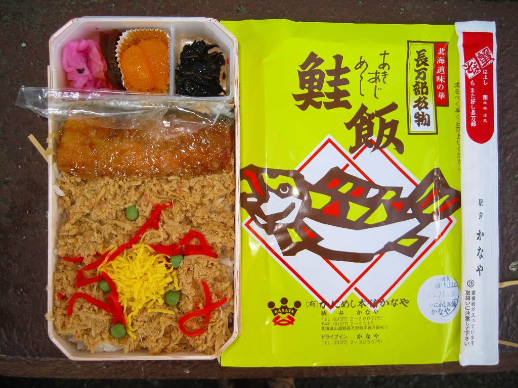 国鉄時代の資料にその名がないため、昭和60年代の発売か。それにしては古めかしい姿をしていると思う、通好みのマイナーな駅弁。有名な駅弁「かにめし」と同じ経木折に、駅弁の名前と食材「さけ」「ほたて」「毛がに」など描いた掛紙をかける。中身は中身は御飯の上にカニほぐし身とホタテ2個、そして衣というかタレをまとう鮭の切り身ひとつ。どこの駅弁や惣菜にも似ない、鮭のなんともいえない味付けに、遠くに来たなと感じさせる強烈な個性が出ている。