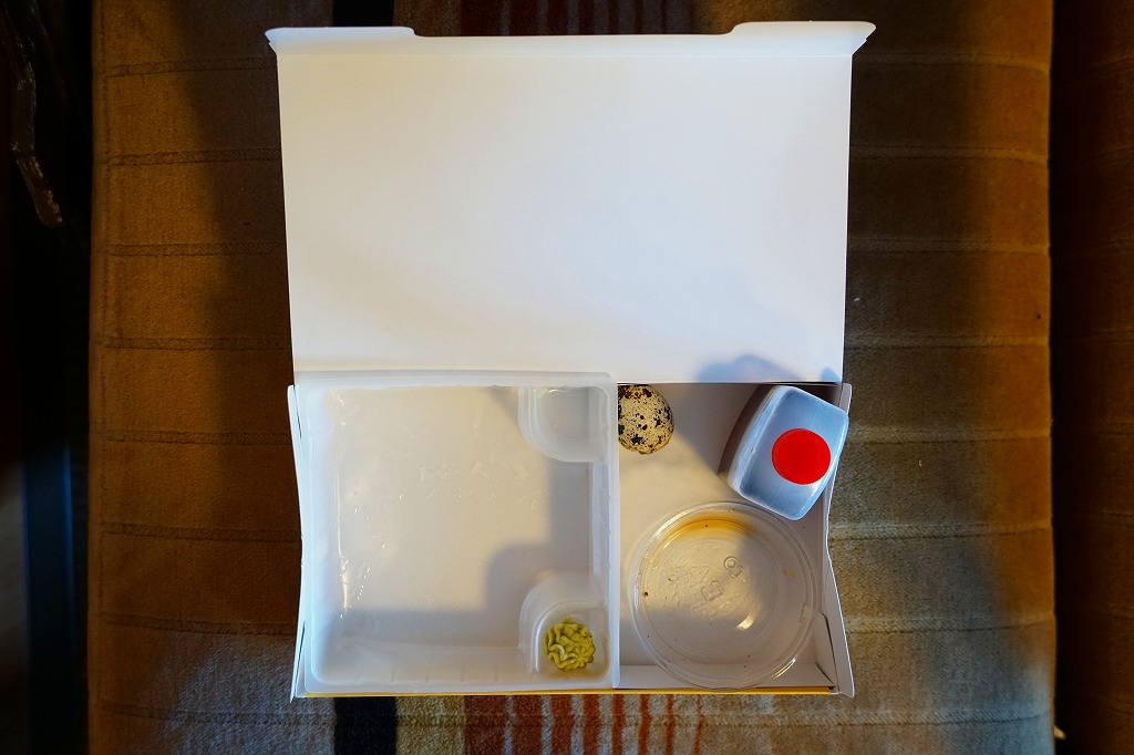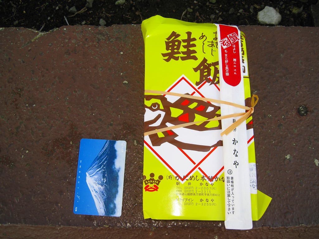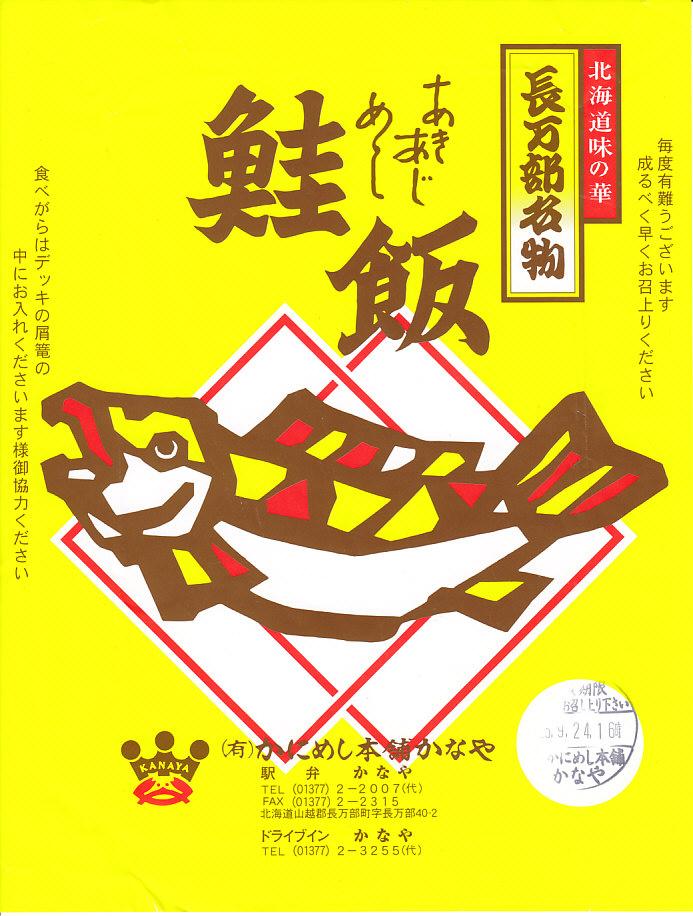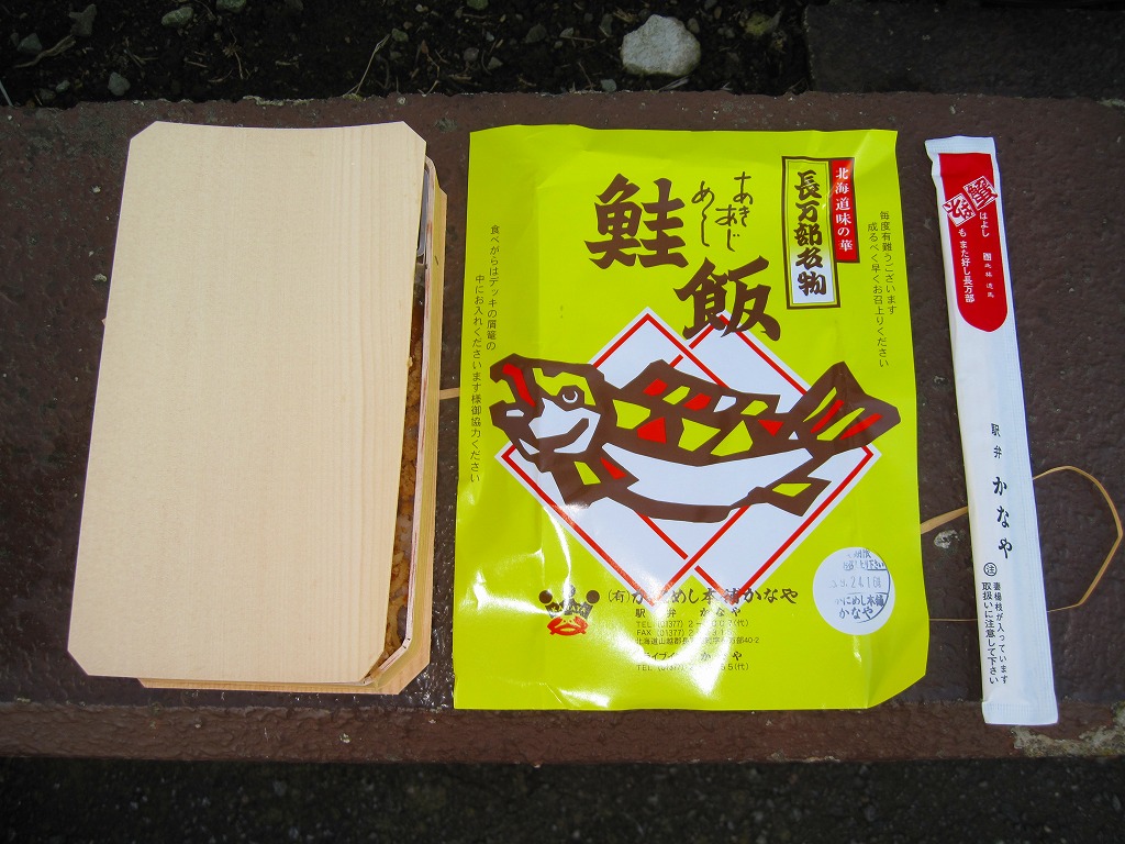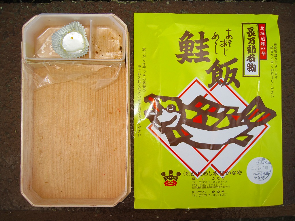 2011(平成23)年9月24日に購入した、長万部駅弁の掛紙。容器も内容も風味も、上記の2020年のものと変わらない。当時の掛紙には「駅弁かなや」の表記や、「食べがらはデッキの屑篭の中にお入れくださいます様御協力ください」の注記があった。やはりここでは「かにめし」なのだろう、ドライブインに注文販売の掲示があったにもかかわらず、レジでの注文時にはかにめしではなくて本当にいいのかと何度も念押しされた。
