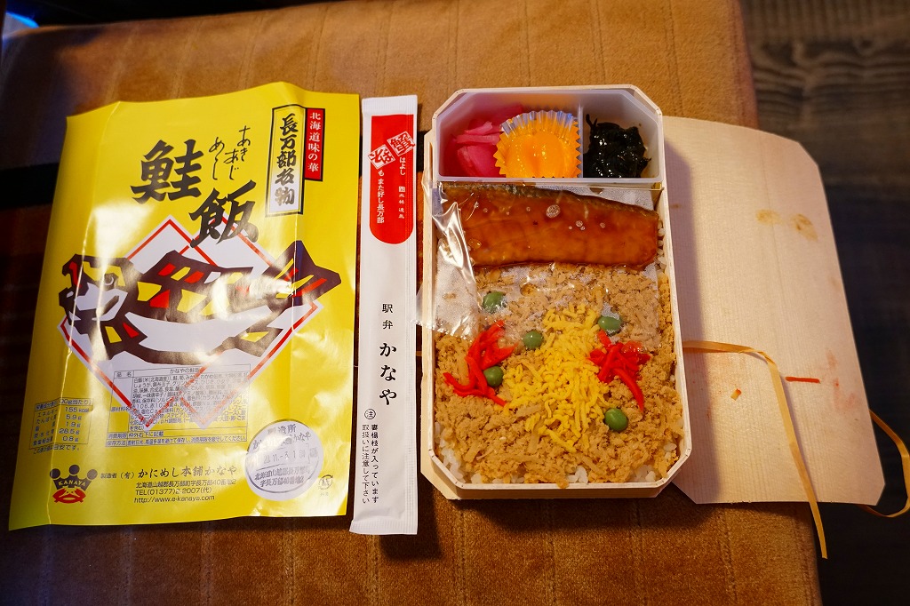 フレークはぼそぼそ、この弁当の特徴である鮭の煮付けは、下記の「蝦夷めし」より分量もワイルドさも半分という軽い印象で、食べやすい感じだった。価格は2018年時点で1,080円。