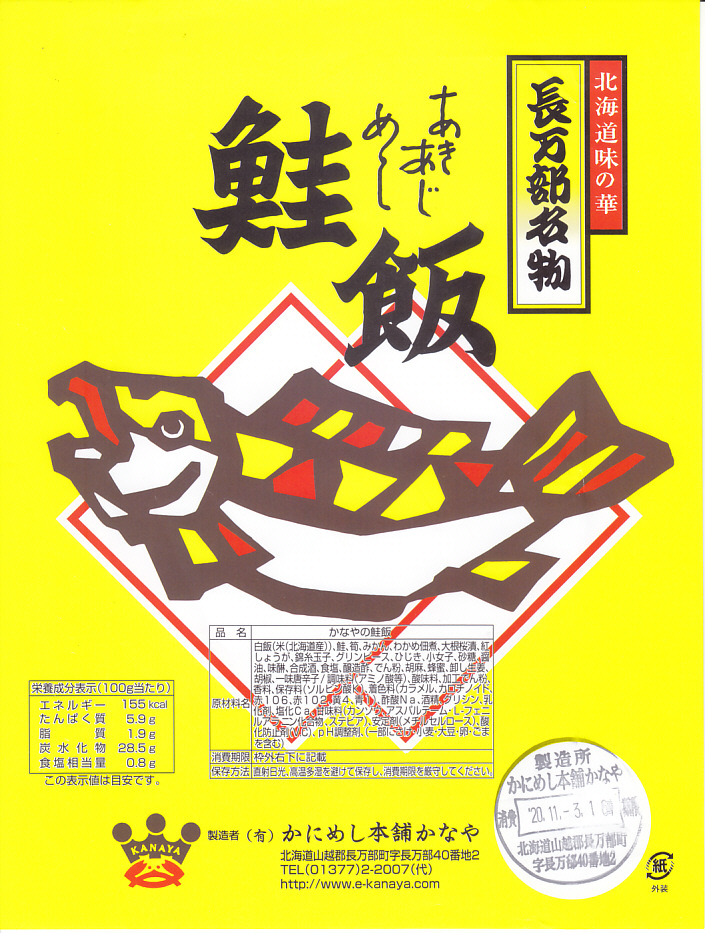 1972(昭和47)年の発売という過去の長万部駅弁で、今はドライブインか駅近くの調製元で注文するお弁当。1960年代の資料にも「鮭飯」(100円)の存在がうかがえる。かにめしと同じ容器に、サケを描いた黄緑色の掛紙をかける。中身は白御飯の上をタケノコ混じりのサケフレークと鮭の煮付けで覆い、錦糸卵と紅生姜とグリーンピースで彩り、ワカメ佃煮、缶詰みかん、大根桜漬、奈良漬を添えるもの。つまりだいたい、かにめしのカニをサケに置き換えたもの。