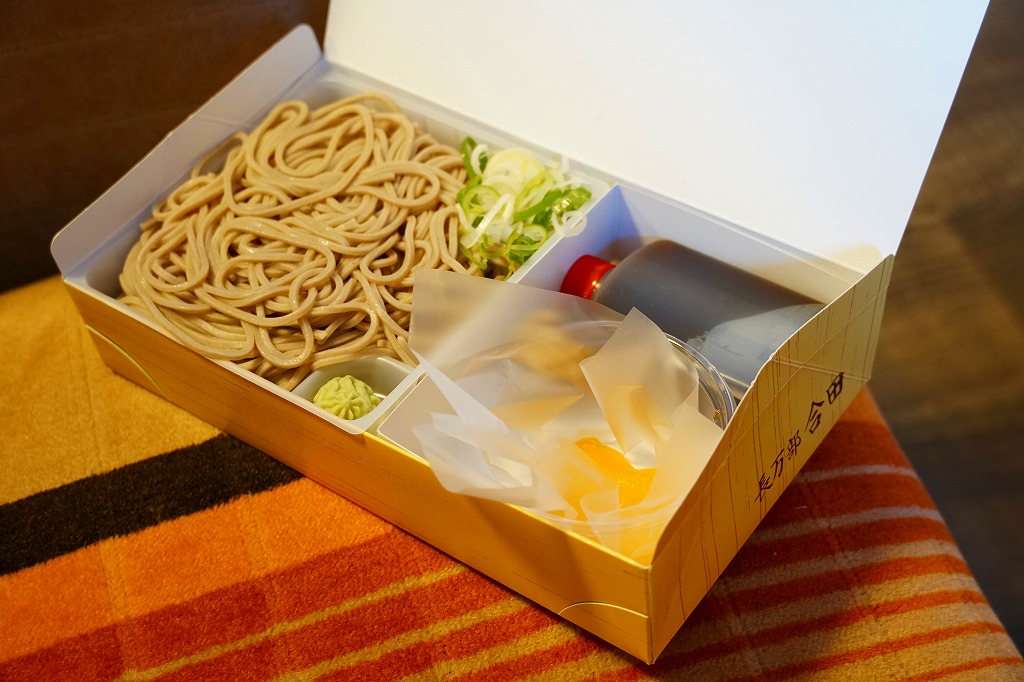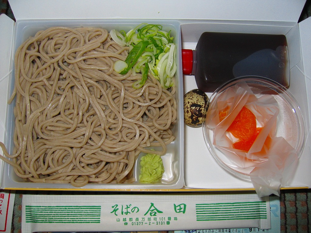 1931(昭和6)年に長万部駅で発売。全国初で、長らく全国で唯一だった、そばの駅弁。専用の厚紙箱に、もりそばと青ネギと練りワサビ、うずらの生卵とミカンとボトルのめんつゆを収める。内容も風味も、名前のとおりのもりそば。