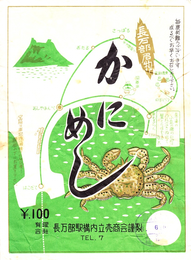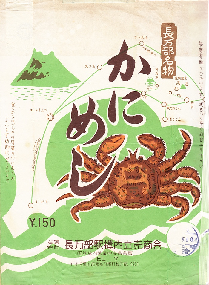 1960年代の調製と思われる、昔の長万部駅弁の掛紙。1960年代の長万部駅弁「かにめし」の緑色の絵柄はだいたい同じ。鉄道路線図がそれぞれ異なるのが興味深い。