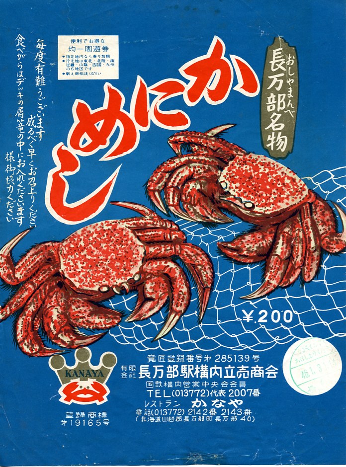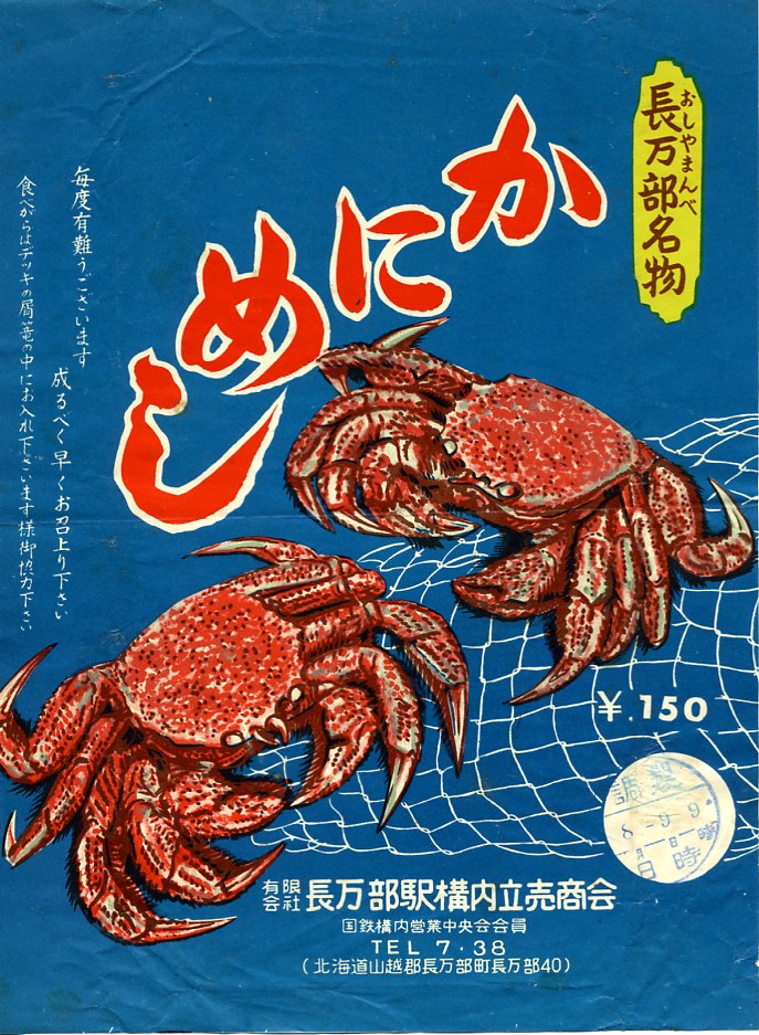 1963(昭和38)年11月18日16時の調製と思われる、昔の長万部駅弁の掛紙。下記の掛紙「かにめし」と、記載内容はほぼ同じだが、絵柄は作り替えられている。長万部駅の名物駅弁「かにめし」の掛紙が青くなる前の姿を残す。