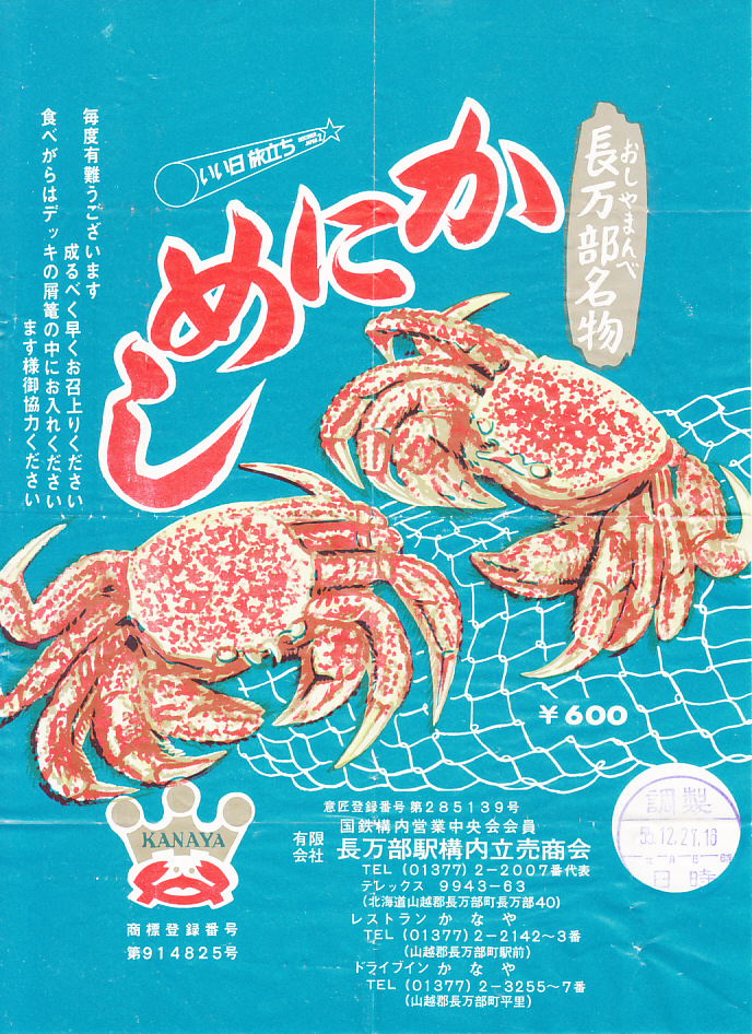 2001(平成13)年9月10日15時の調製と思われる、昔の長万部駅弁の掛紙。下記の1994年のものと比べて、価格がシールから印字に変わり、調製印が調製日時と消費期限の年月日時二段書きに変わり、意匠登録や商標登録の記述、食中毒防止の注意書き、テレックスの番号、和風レストランの表示が消えている。