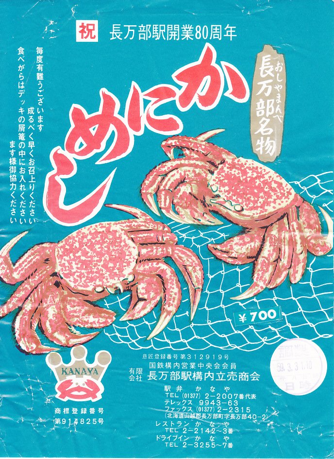 1984(昭和59)年3月31日10時の調製と思われる、昔の長万部駅弁の掛紙。絵柄に変化はないが、上部に「祝長万部駅開業80周年」の文字が加わり、価格がシールで700円に訂正されている。