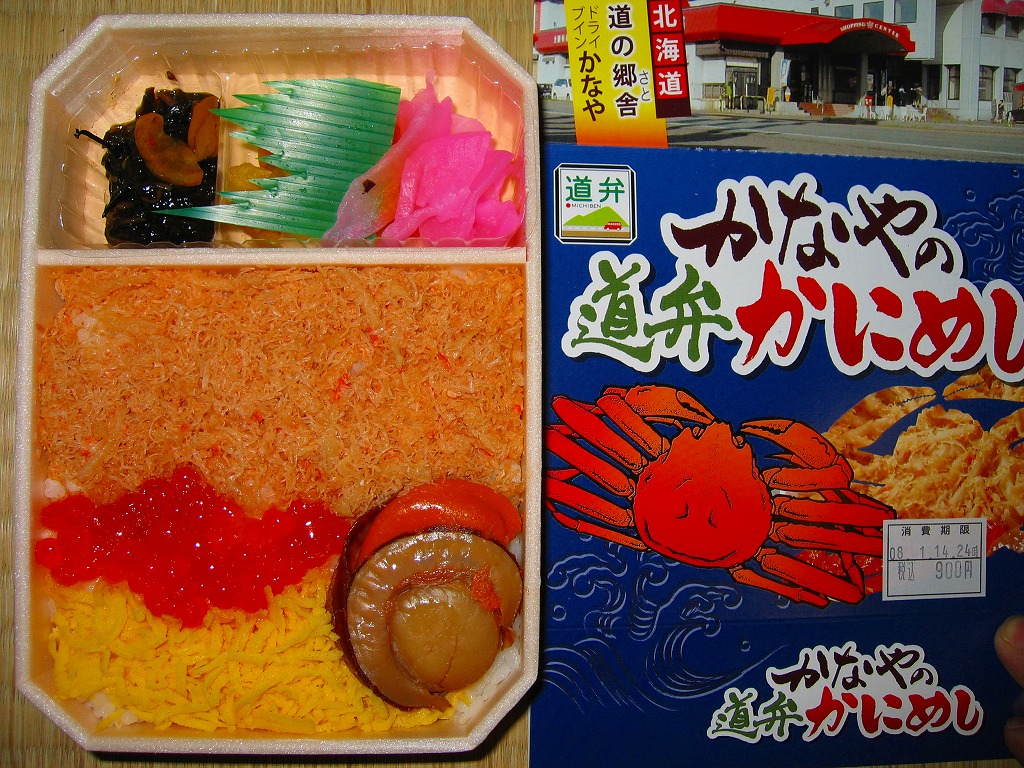 2007(平成19)年の秋までに投入された、「道弁」なる駅弁催事向け商品のひとつ。長万部駅弁のかにめしのように角を落とした、長方形の小さな容器を、スーパーやデパートの売り場での見栄えを重視した構造だと思える、立ち上がり付きのボール紙の枠にはめる。中身は白御飯の上にかにフレーク、イクラ、業務用冷凍錦糸卵、帆立をを乗せるもの。