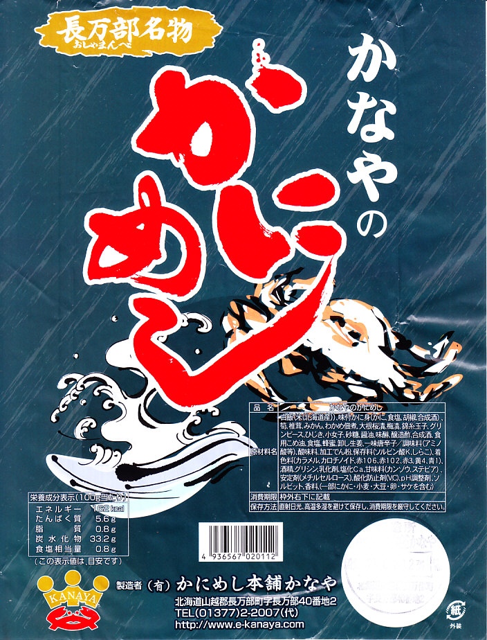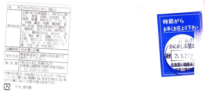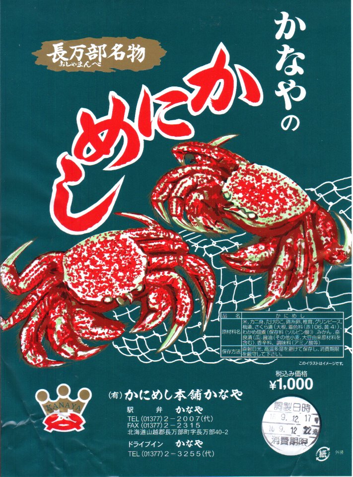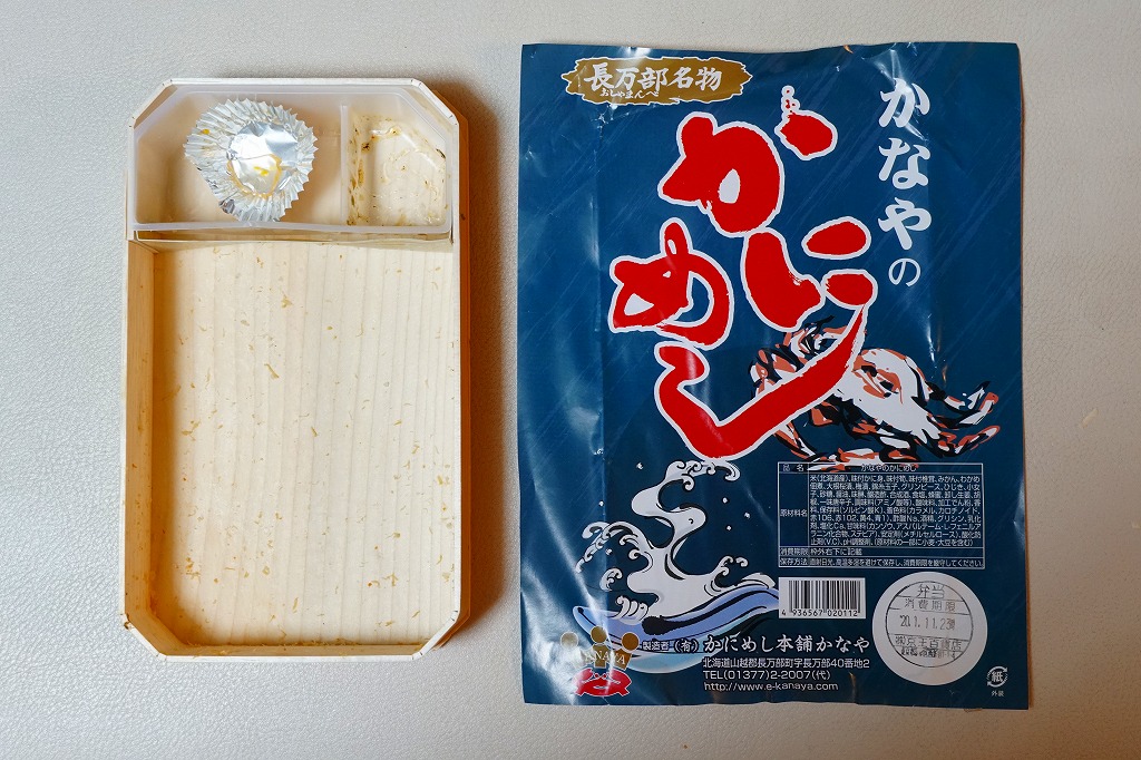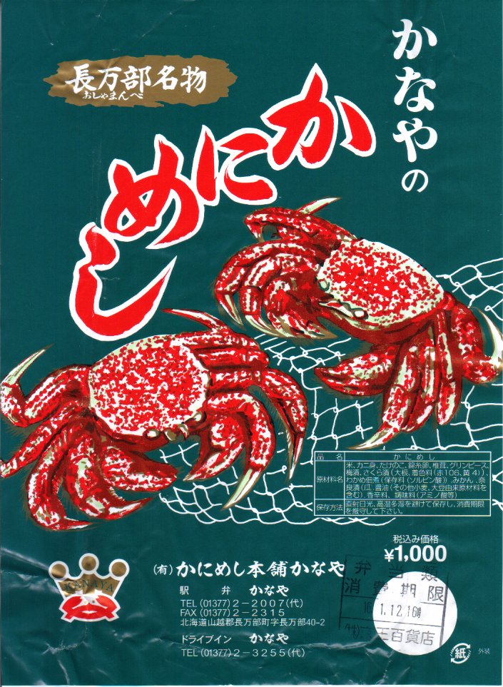 上記の駅弁「かなやのかにめし」の、2020(令和2)年時点での姿。デパートの駅弁大会での実演販売で購入したが、長万部の現地のものと変わらない。下記の2006年のものや、上記の2025年のものと、掛紙の法定表記を除き変わらない。