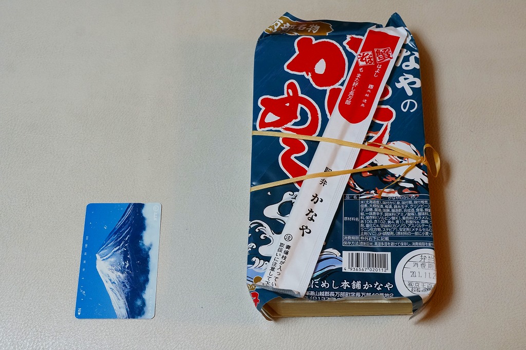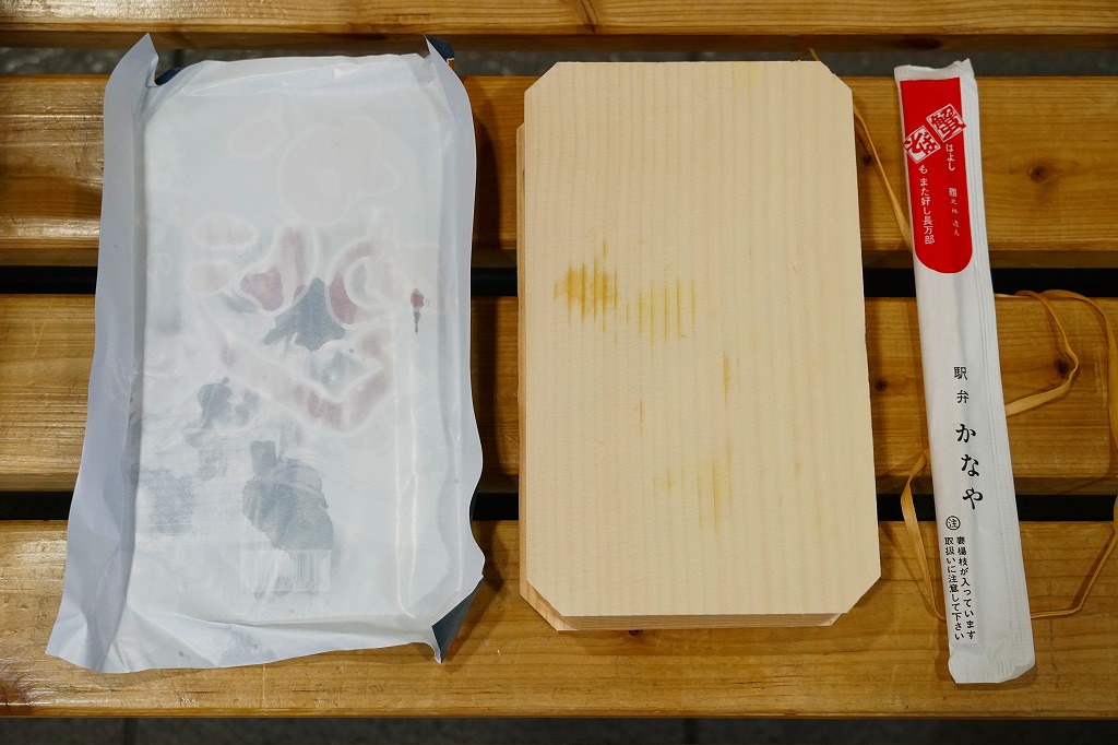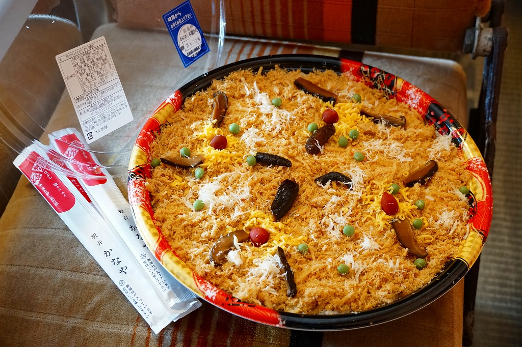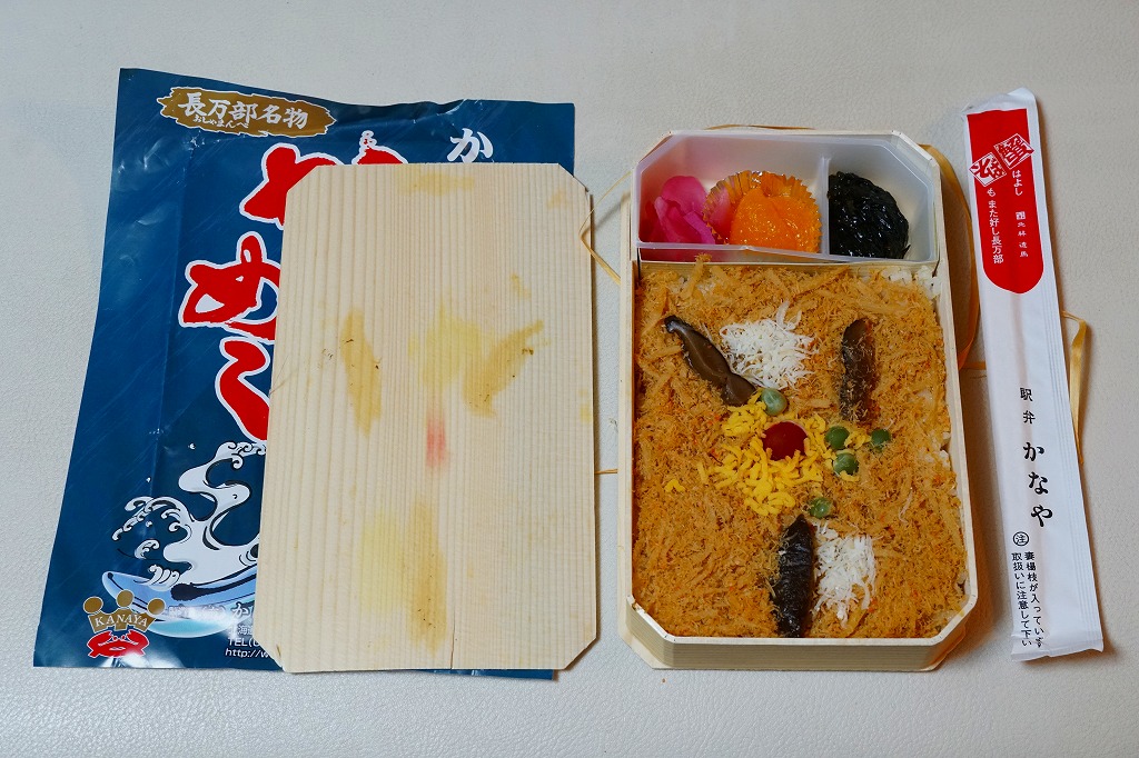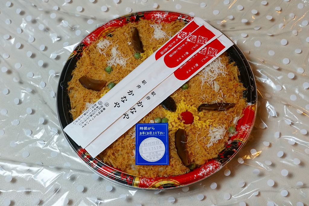 上記の駅弁「かなやのかにめし」の、2020(令和2)年時点での姿。デパートの駅弁大会での実演販売で購入したが、長万部の現地のものと変わらない。下記の2006年のものや、上記の2025年のものと、掛紙の法定表記を除き変わらない。