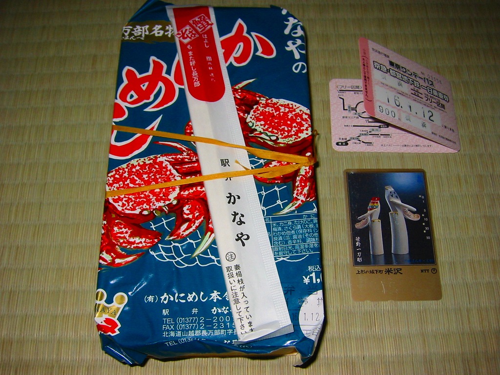 2006(平成18)年1月22日に購入した、長万部駅弁の掛紙。これも駅弁大会での購入だが、掛紙も容器も中身も風味も、現地のものと変わらない。今まで半世紀間、ずっとリアルに描かれていたカニが、なぜか抽象画になってしまった。