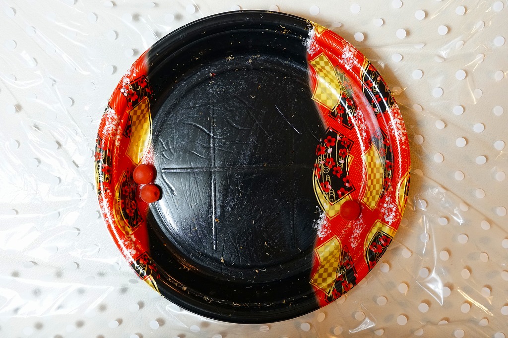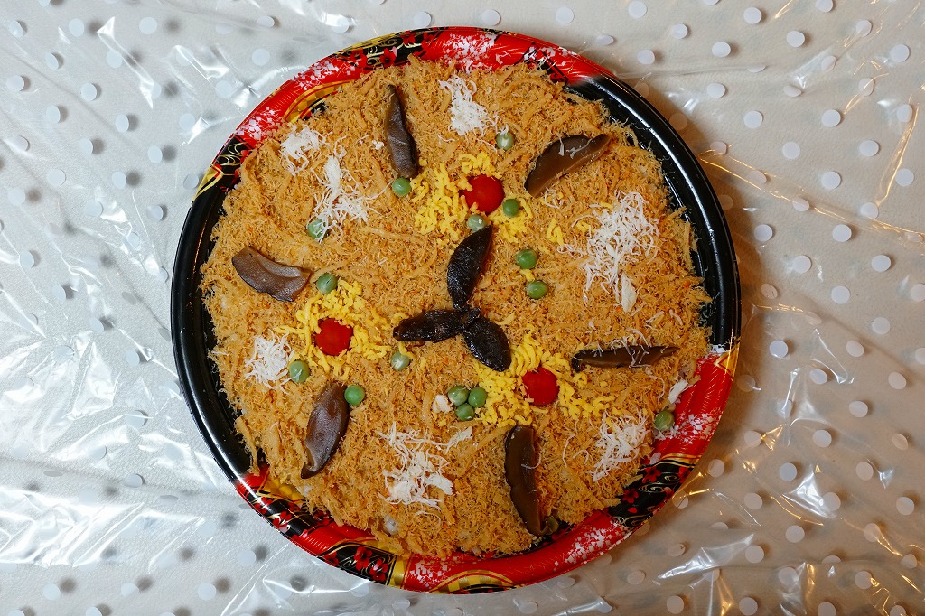長万部駅の駅弁「かにめし」の3人前版。付合せがない、味付飯の上にタケノコ混じりのカニほぐし身を敷き詰め、錦糸卵、シイタケ、梅干し、グリーンピースで彩るかにめしのみが、丸い容器に敷き詰められる。味は1人前のかにめしと、たいして変わらない。経木折が発泡材のプラ容器になっても、具が炒り物で水気の影響があまりなかったか。
