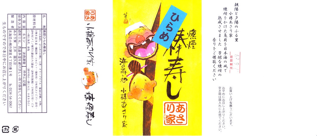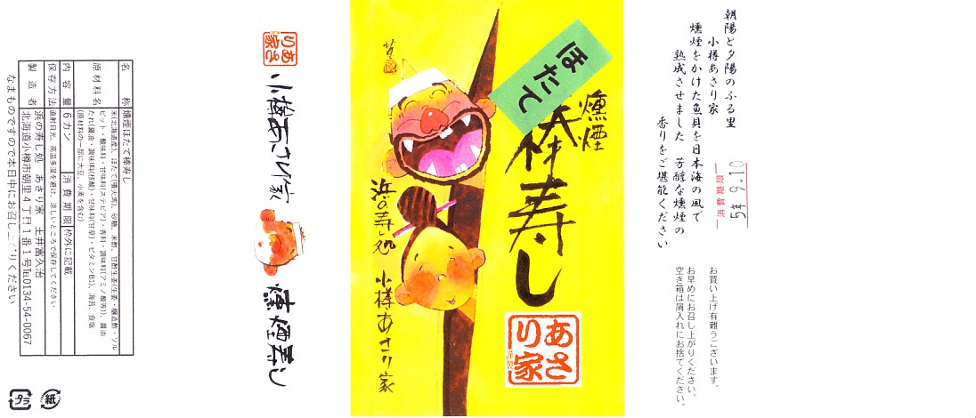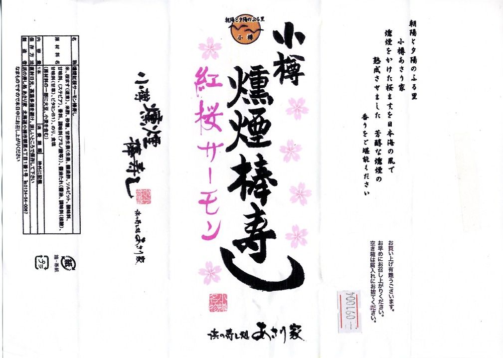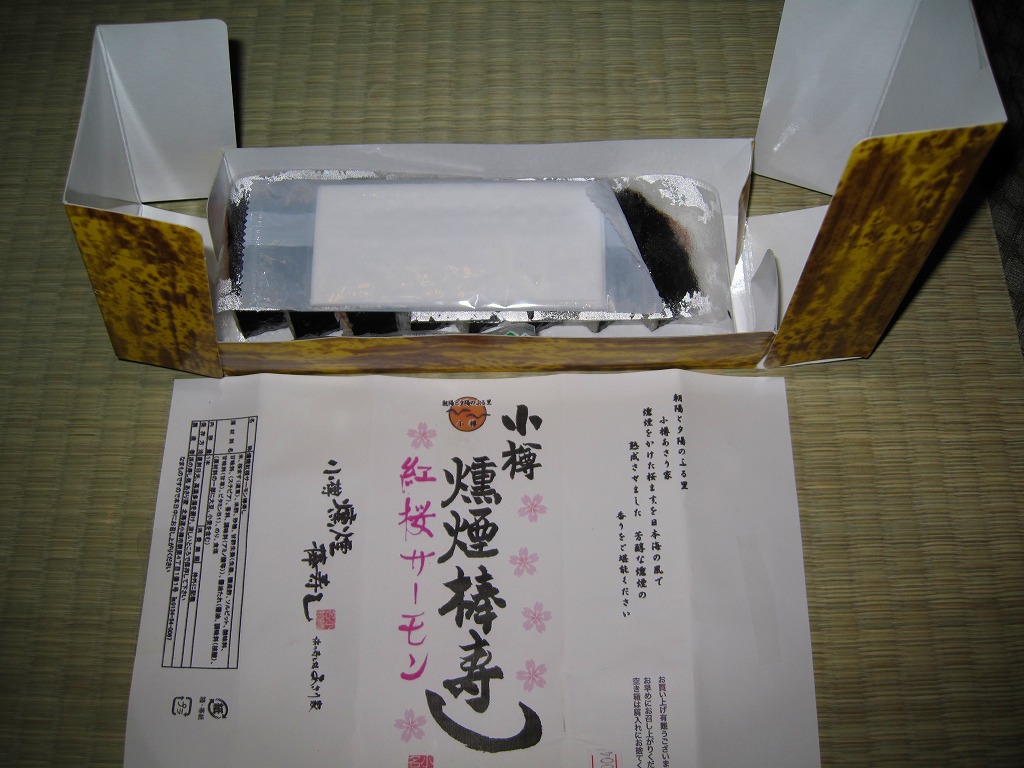 小樽駅の土産物店の駅弁売り場で買えた棒寿司。上記の商品と同じ体裁で、掛紙に「さば」「さーもん」「ほたて」と貼り、具をサバ2切れ、サーモン2切れ、ホタテ2切れに置き換えた。このシリーズの商品の、食べて便利なオールスター。
