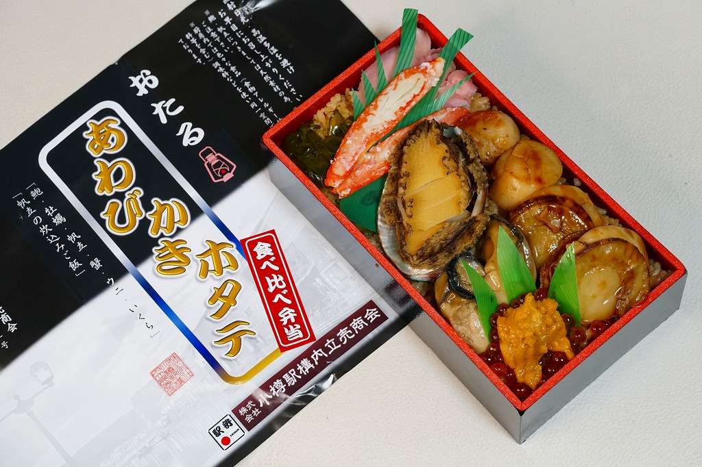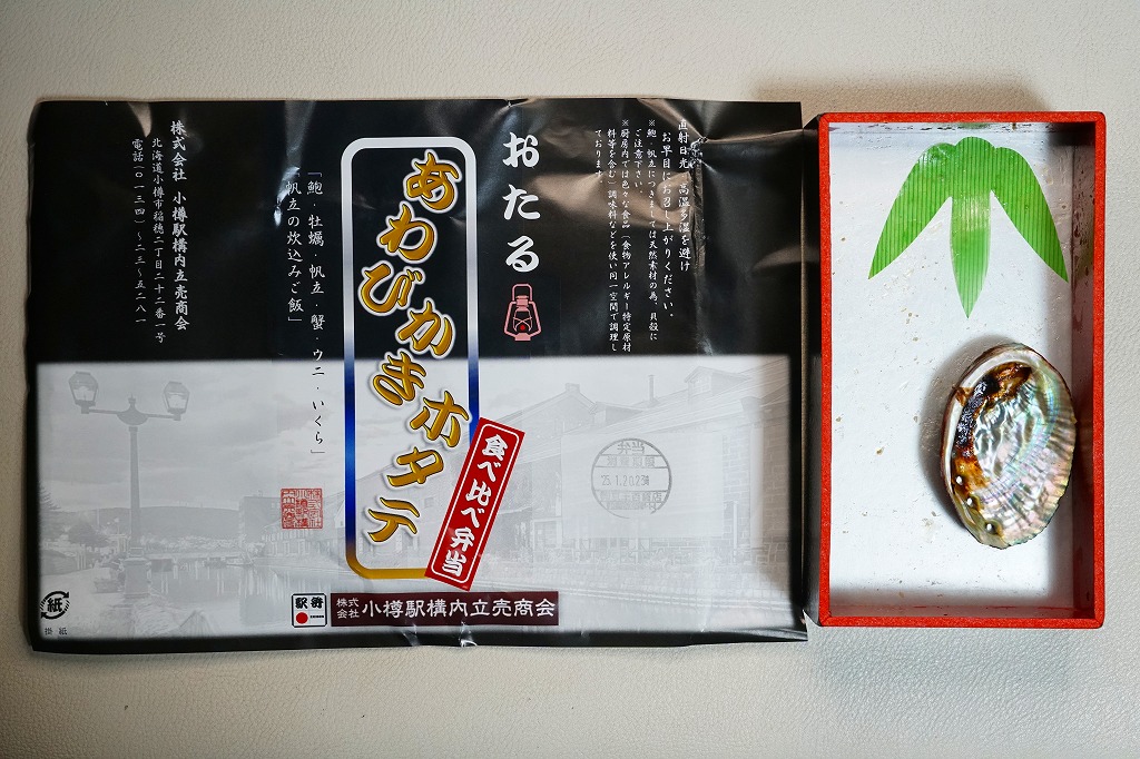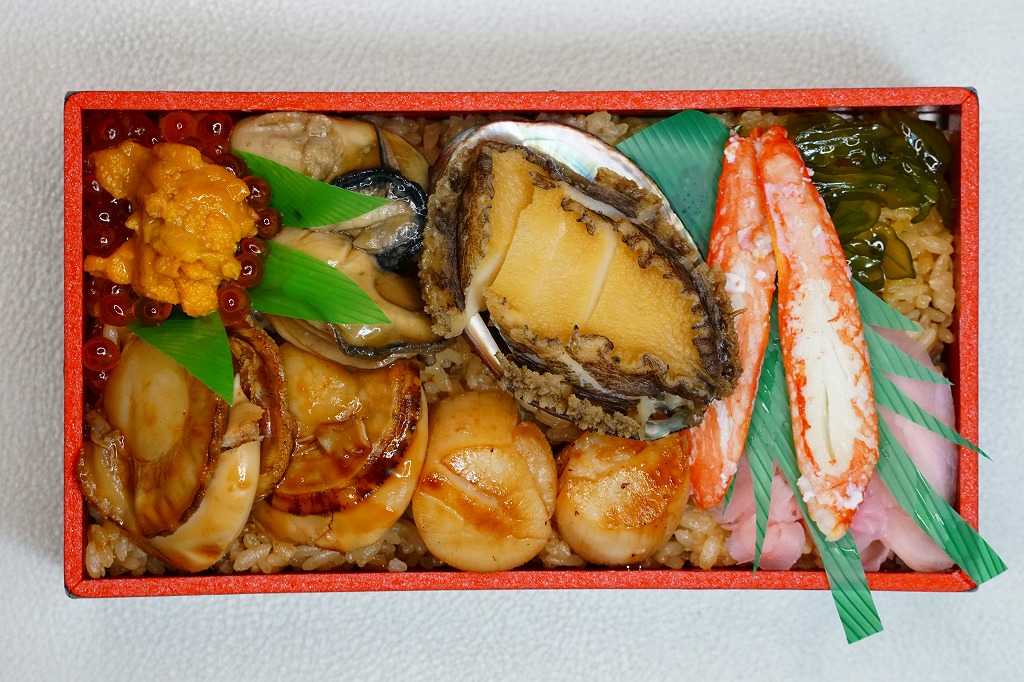 2025(令和7)年1月の京王百貨店の駅弁大会で、小樽駅の駅弁として実演販売。長方形のプラ容器に帆立の炊込みご飯を詰め、鮑、牡蠣、帆立、蟹、ウニ、いくらで覆い、わかめと甘酢生姜を添える。海鮮でも寿司や刺身でなく茶色くなった、見栄えで盛らない具だくさんの海鮮弁当。こんなに高価なので、京王百貨店や阪神百貨店の駅弁大会にしか出てこられないのではと思う。この年は阪神百貨店の駅弁大会がなかったので、この京王百貨店の駅弁大会でのみの販売か。