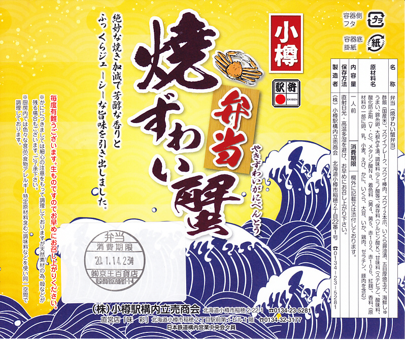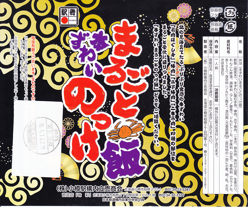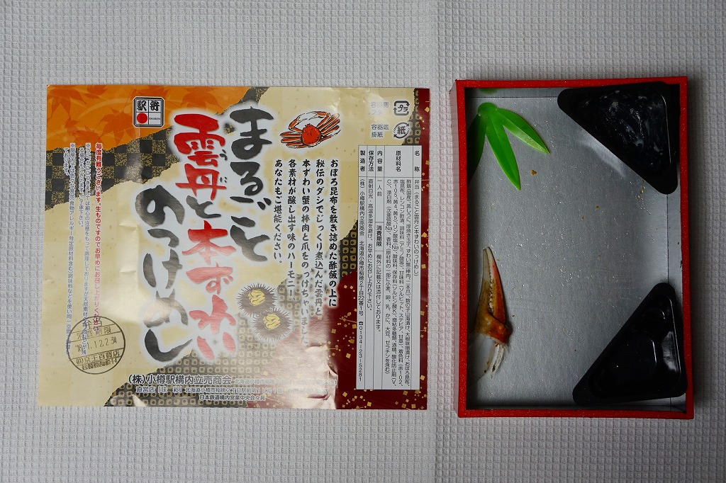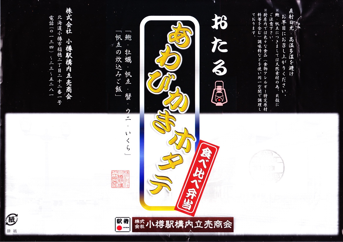 駅弁として疑義を感じる以前に、商品には電話番号「0120-001452」を除いて調製元や消費期限など製造者に関する情報がまったくなく、食品衛生の法令に違反するのではないかと思う。後のスーパーのチラシでは小樽駅弁ではなく「小樽名物」と表示したり、現物に調製元の情報が入ったりしているのは確認している。2022−2023年の秋冬の駅弁大会シーズンでもまだ、性懲りもなく売られている模様。そのシーズンまでの販売か。