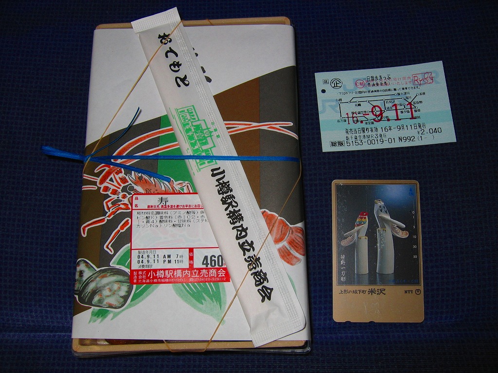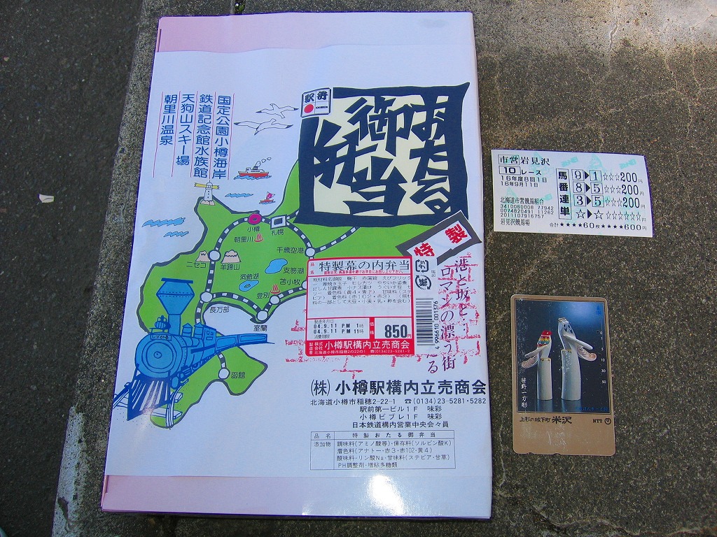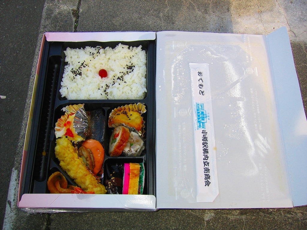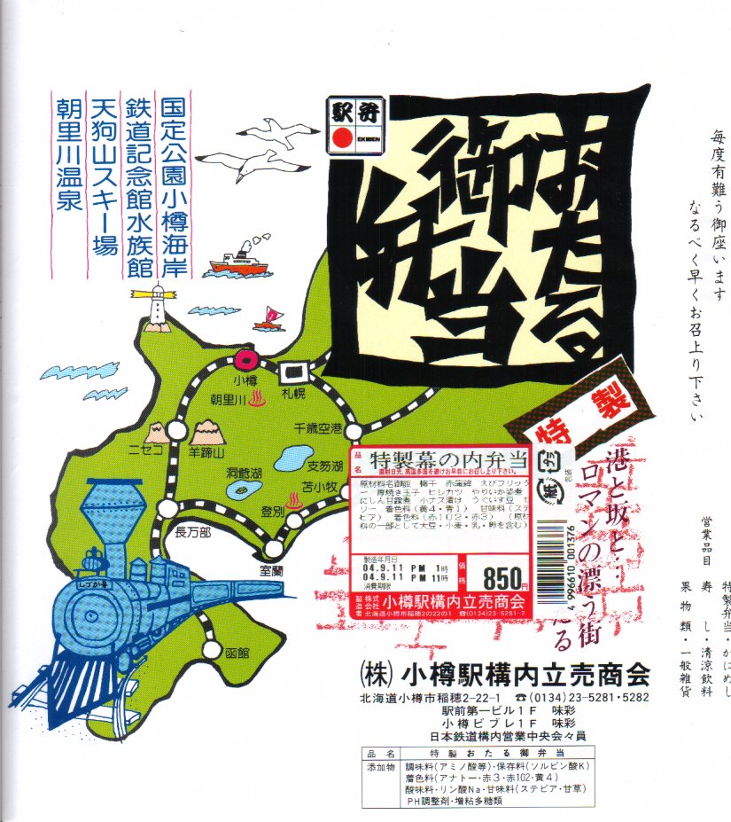 小樽駅の特製幕の内弁当。特製でない幕の内弁当は掛紙のない普通の惣菜弁当なので、こちらだけを購入した。市販の仕出し弁当向けボール紙箱に、道南の地図と北海道最古級の蒸気機関車しづか号のイラストを載せた掛紙をかける。中身は日の丸ご飯に蒲鉾や玉子焼やエビフライ、そしてニシン甘露煮や帆立やイカ・イクラ・数の子和えにシウマイや大学芋など、かすかに北海道らしいうまいものがいろいろ詰まる。価格は2004年の購入時で850円、2014年時点で900円。2019年時点で現存しない模様。