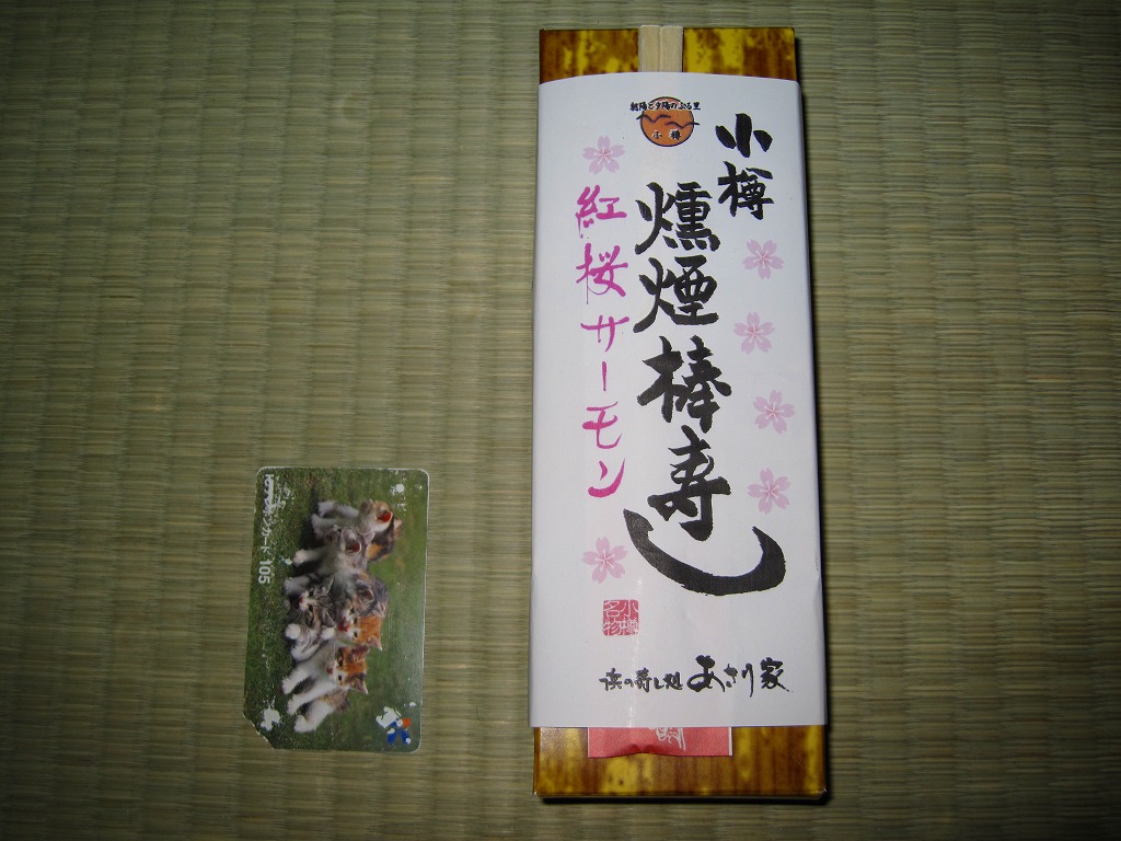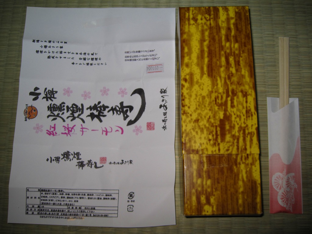 小樽駅のキヨスクで買えた、土産物タイプの棒寿司。竹皮タイプのボール紙製容器を、商品名を書いた白い掛紙で巻き、セロテープで留める。中身はスモークしたサクラマスの棒寿司を海苔で巻いてスライスした、太巻きに見える棒寿司。調製元は朝里駅前の寿司屋で、他にサンマ、サバ、ニシン、サケのものもある模様。駅では現存しないのではないかと思う。