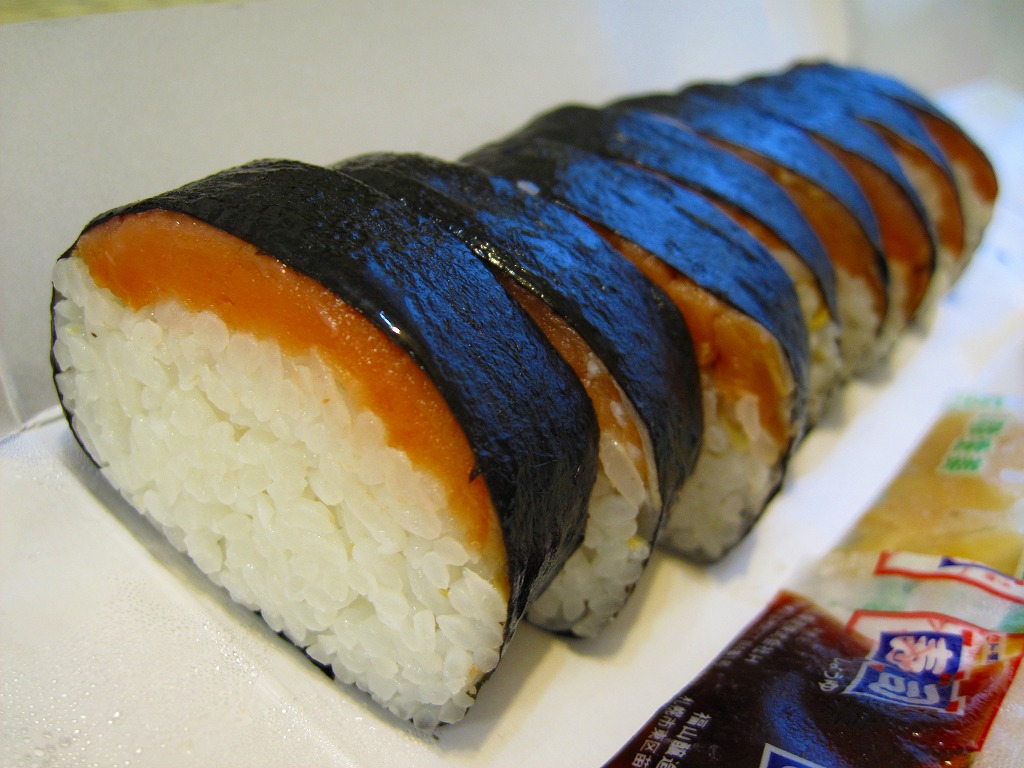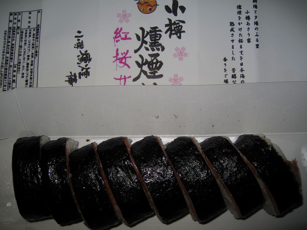 小樽駅の土産物店の駅弁売り場で買えた棒寿司。上記の商品と同じ体裁で、掛紙を白くして、酢飯にハスカップ液を少し染み込ませ、サバを載せたものを3切れ、サーモンを載せたものを3切れ、海苔で巻く。身の薄さとハスカップの酸味で、棒寿司より爽やかに思える海苔巻き。