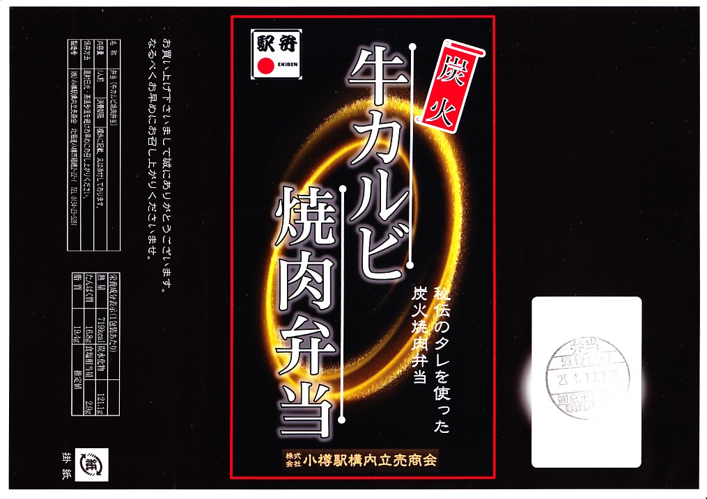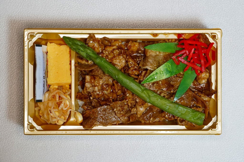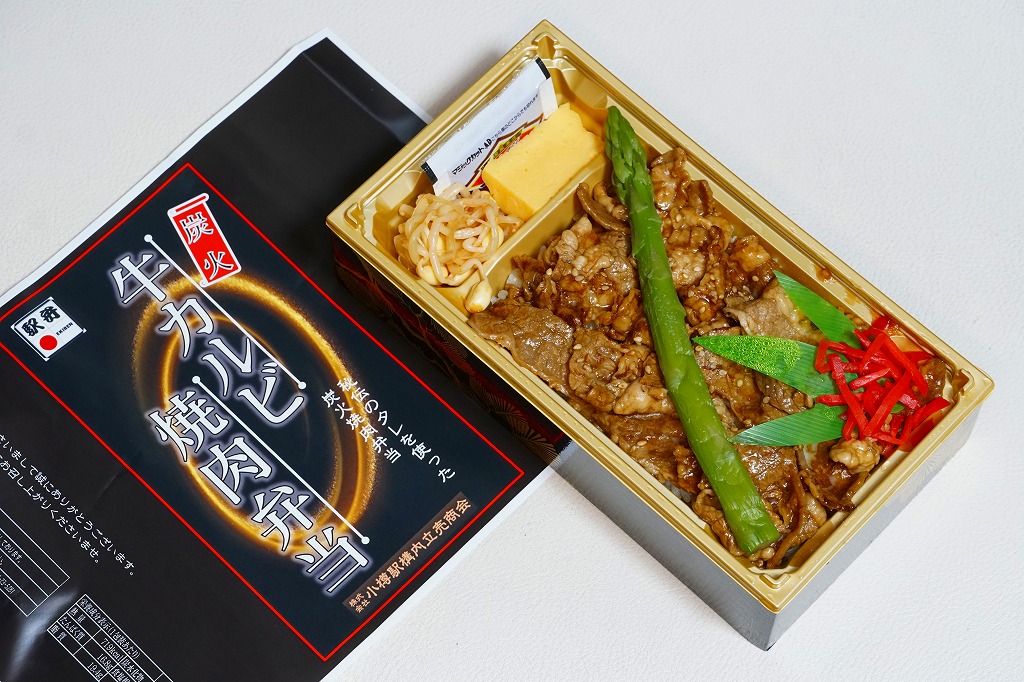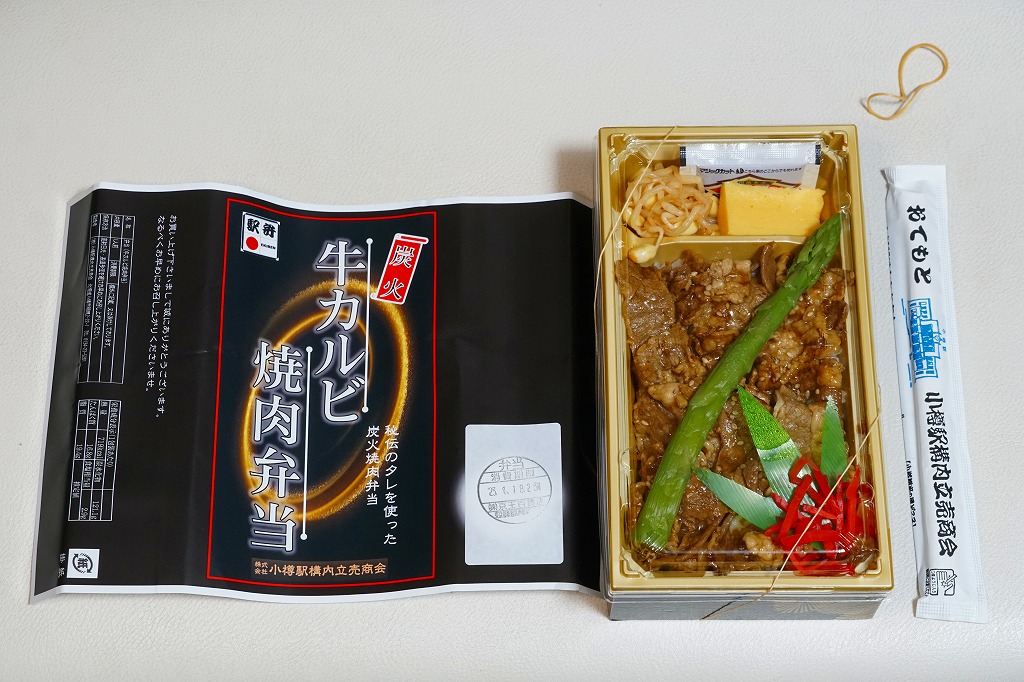 2023(令和5)年1月の京王百貨店の駅弁大会で実演販売。長方形のプラ容器に白飯を詰め、炭火牛カルビ焼肉で覆い、アスパラガスと紅生姜と、玉子焼ともやしナムルを添える。アスパラガスがどんと斜めに横たわるのは目新しいが、それ以外は各地とこの催事場でもよくある牛焼肉弁当。今回の小樽駅弁の実演販売は、今までの「海の輝き」を代表とする小樽らしさが、寿司や海鮮や市街や夜景が、内容からも掛紙からも消えていたことが興味深い。これが米沢駅や草津駅の駅弁だと言われても、違和感がない。価格は催事では1,380円だが、どうも現地では1,050円で発売し、2024年時点で1,080円で売られる模様。
