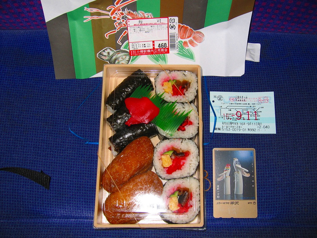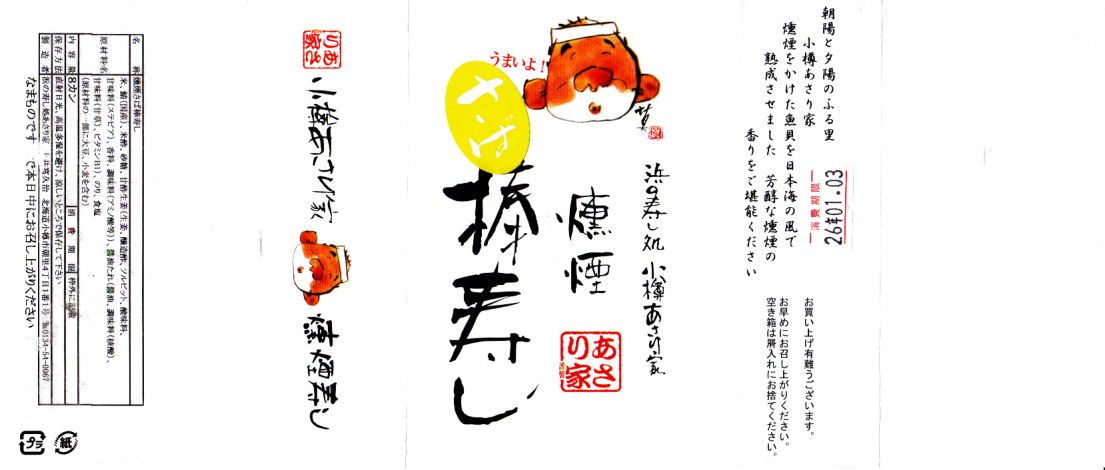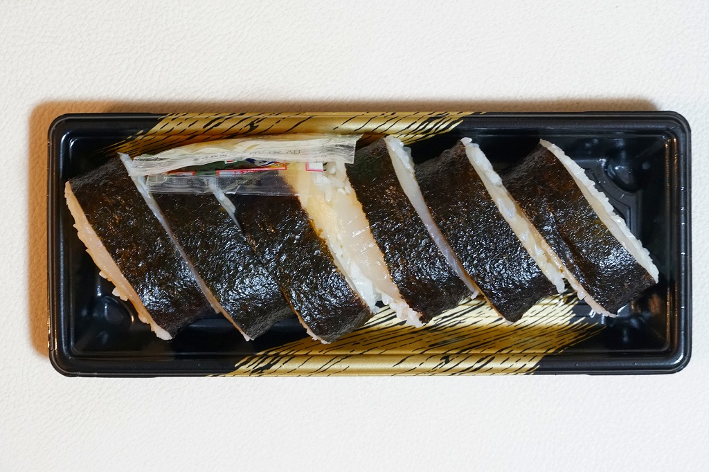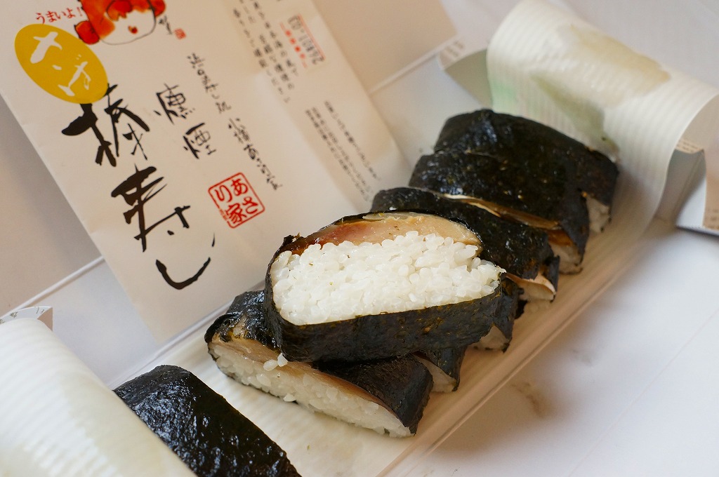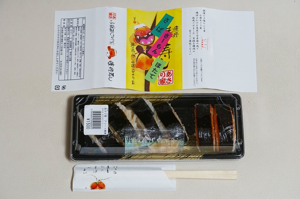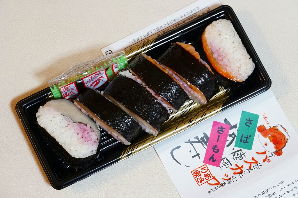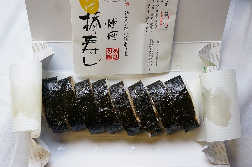 白い掛紙を巻いた白い紙箱に、太巻きが8切れ。中身は酢飯に燻煙で香りを付けたサバを貼り合わせ、海苔で巻いたもの。海苔の使用を除き、普通のタイプのサバ棒寿司も、味はスマート。駅での販売は2014年頃までか。