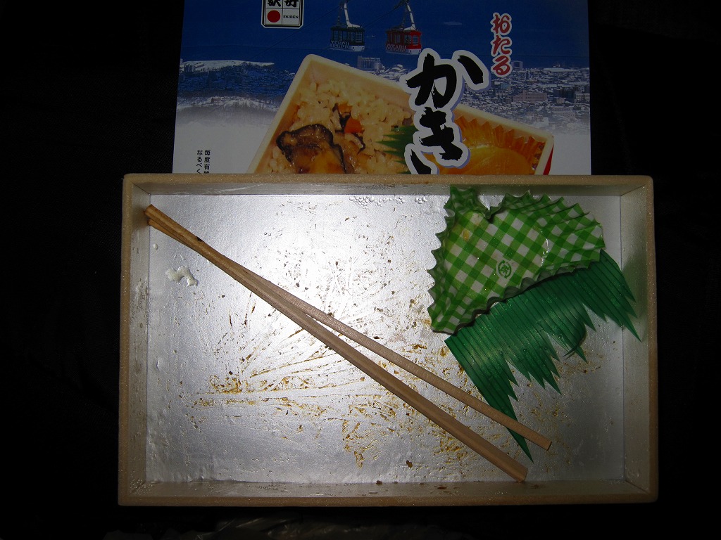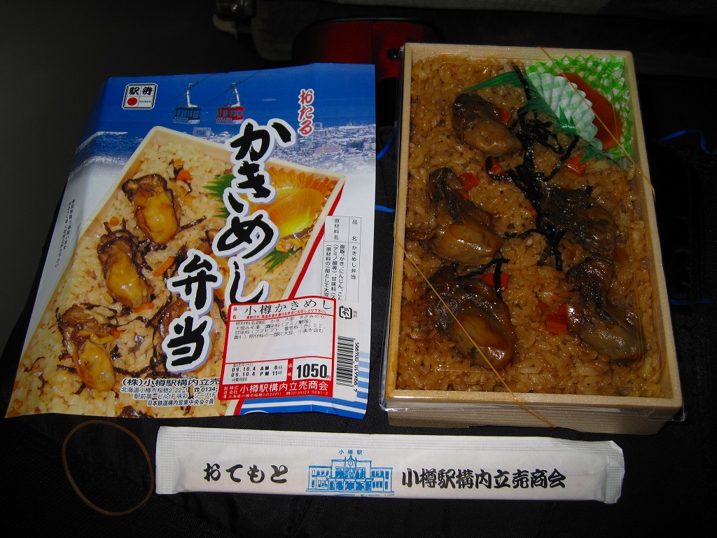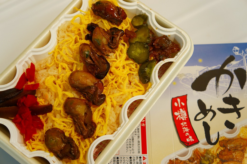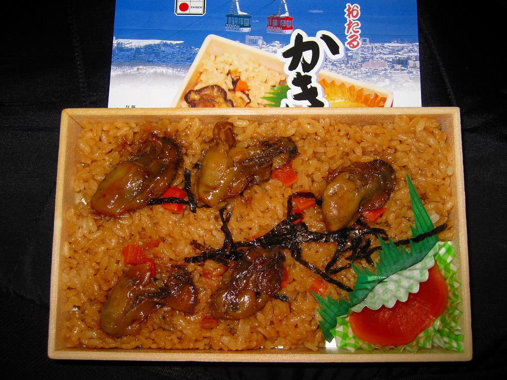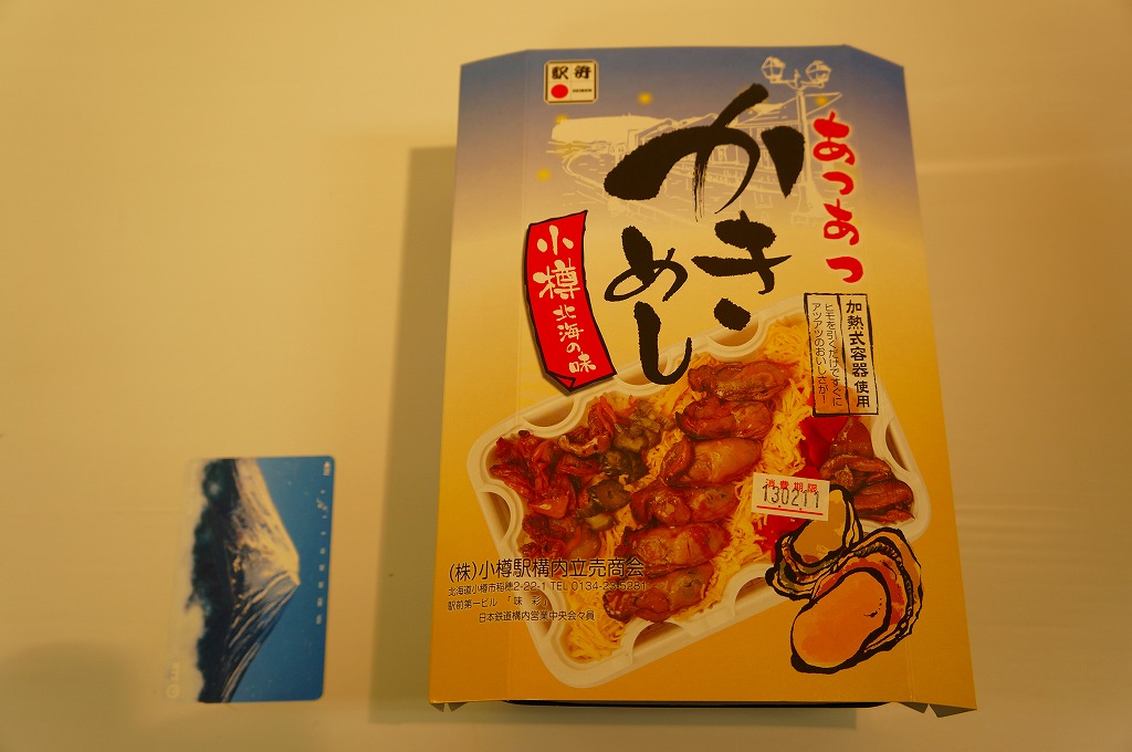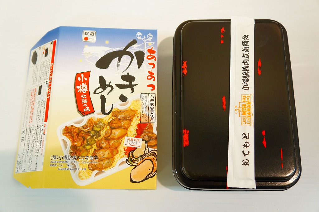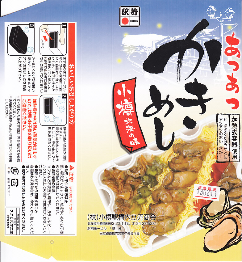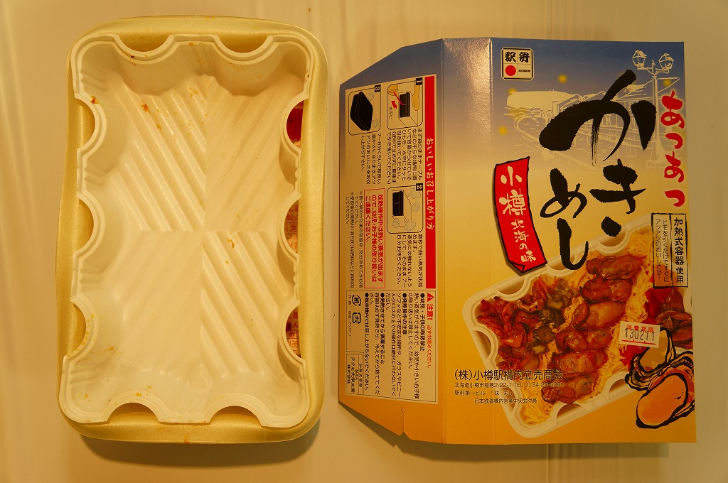 上記の小樽駅弁「おたるかきめし」の、加熱機能付き容器版。冬季限定とも、催事限定とも言われる。これは百貨店の駅弁催事での実演販売で購入したのだが、カキから錦糸卵まですべての具の分量が、パッケージの見本写真の半分くらいしかなく、悲しかった。価格は2013年の購入時で1,150円、2014年4月の消費税率改定で1,200円。2017年までの販売か。