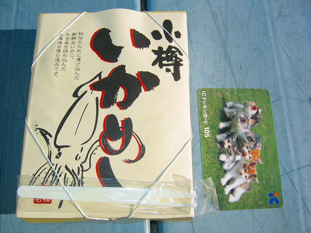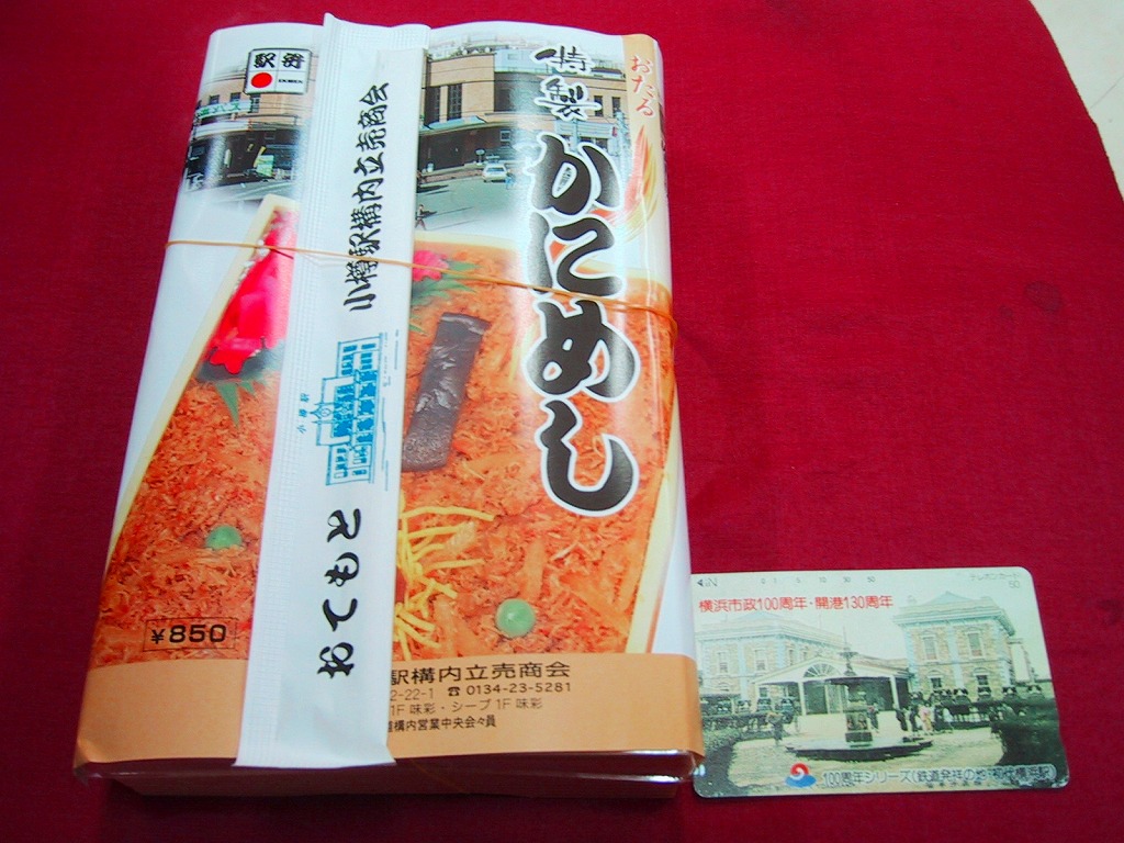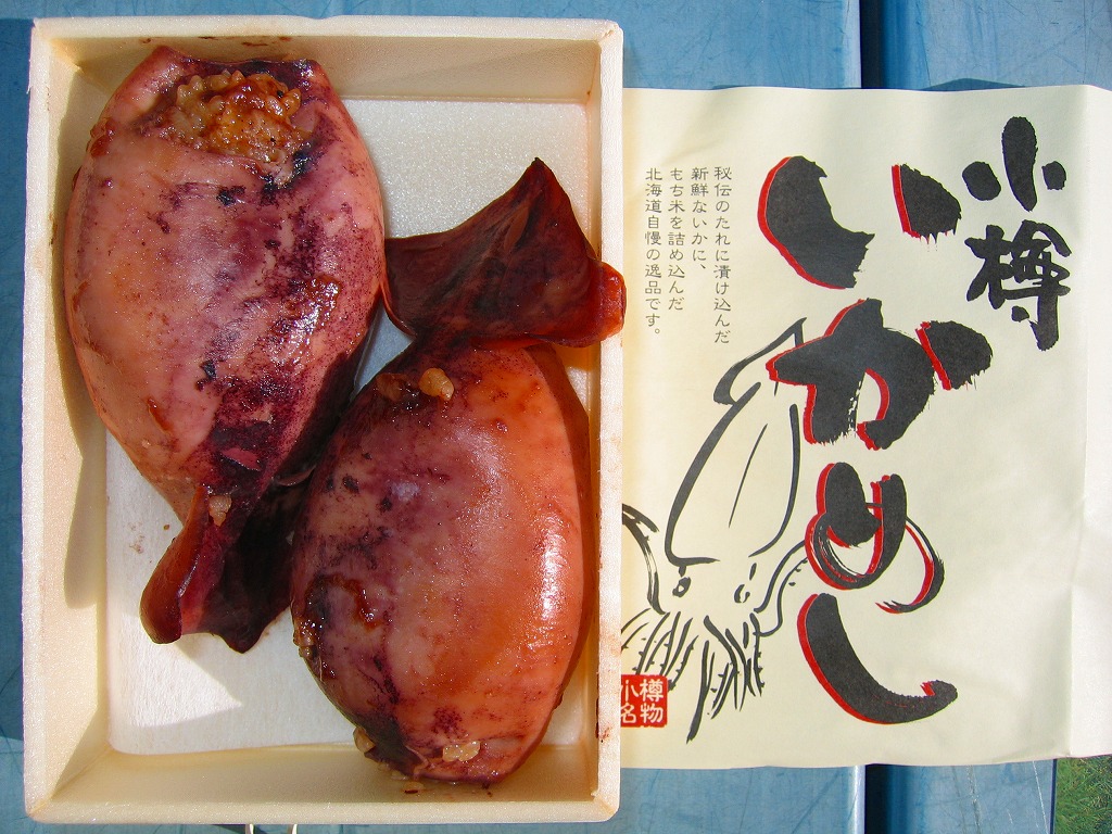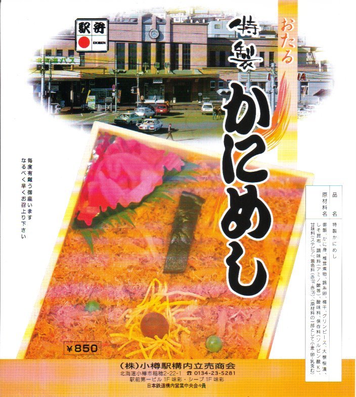 偽物の駅弁。スーパーの駅弁催事で、小樽駅の駅弁を名乗る商品。容器の構造は森駅の有名駅弁「いかめし」に似て、中身と風味と価格は福井県の敦賀駅の無名駅弁「越前いかめし」に似る。掛紙では駅弁をうたわないが、左端注記に「容器・空ビン・あき缶等はくず入れにお捨てください。」と、駅弁を臭わせる。