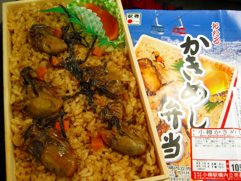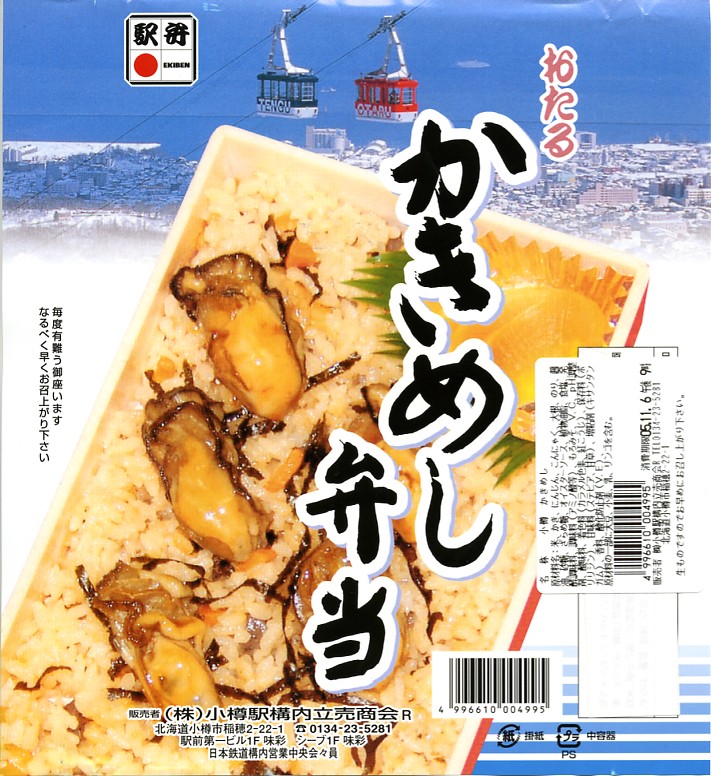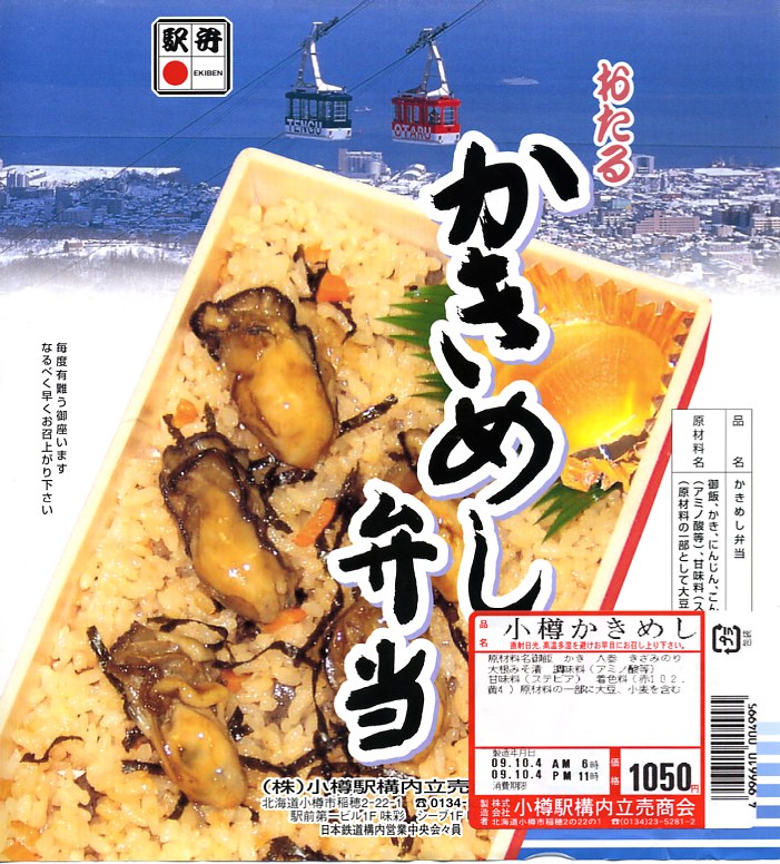 浅い長方形の容器に、カキの煮汁で炊いたという茶飯を詰め、カキ煮とニンジンと刻み海苔を散らし、大根みそ漬を添える。掛紙にはその中身と小樽天狗山ロープウェイの写真を載せる。有名な厚岸駅の駅弁「かきめし」に似ていて、風味は似ず、味も香りも物足りないくらい弱いと感じた。価格は2009年の購入時で1,050円、2014年4月の消費税率改定で1,080円。