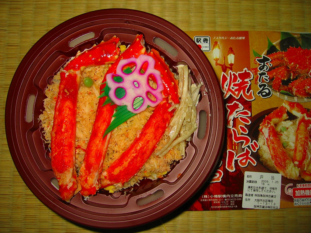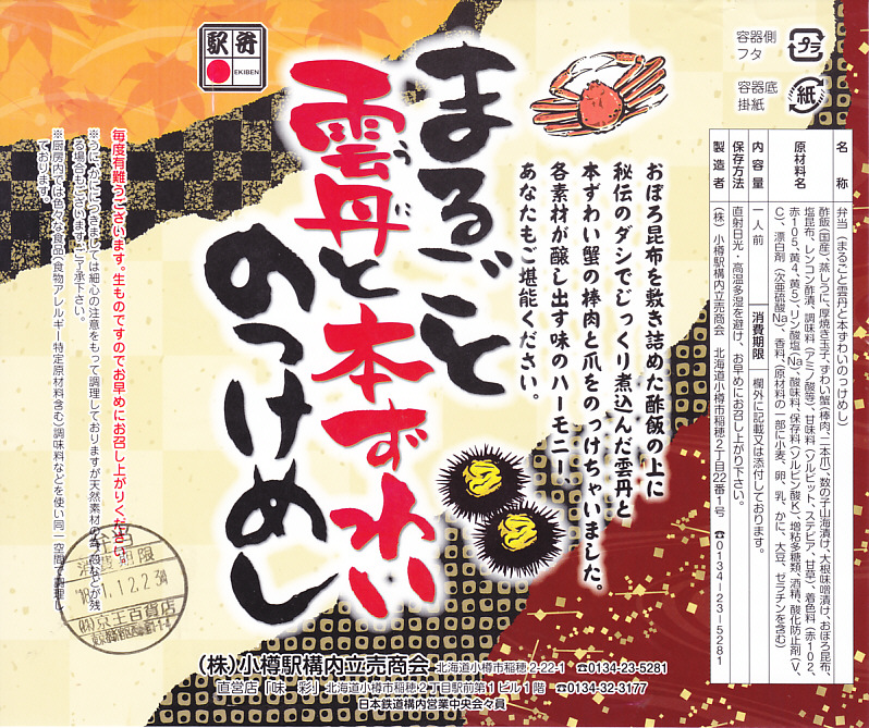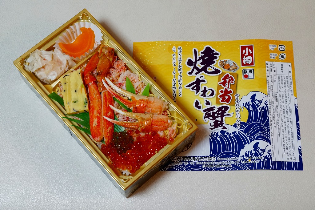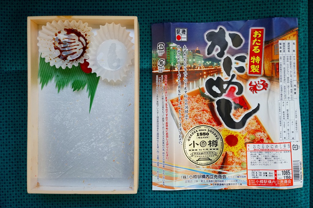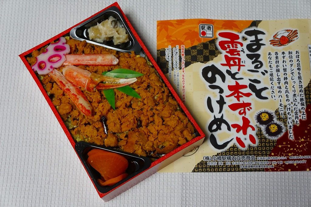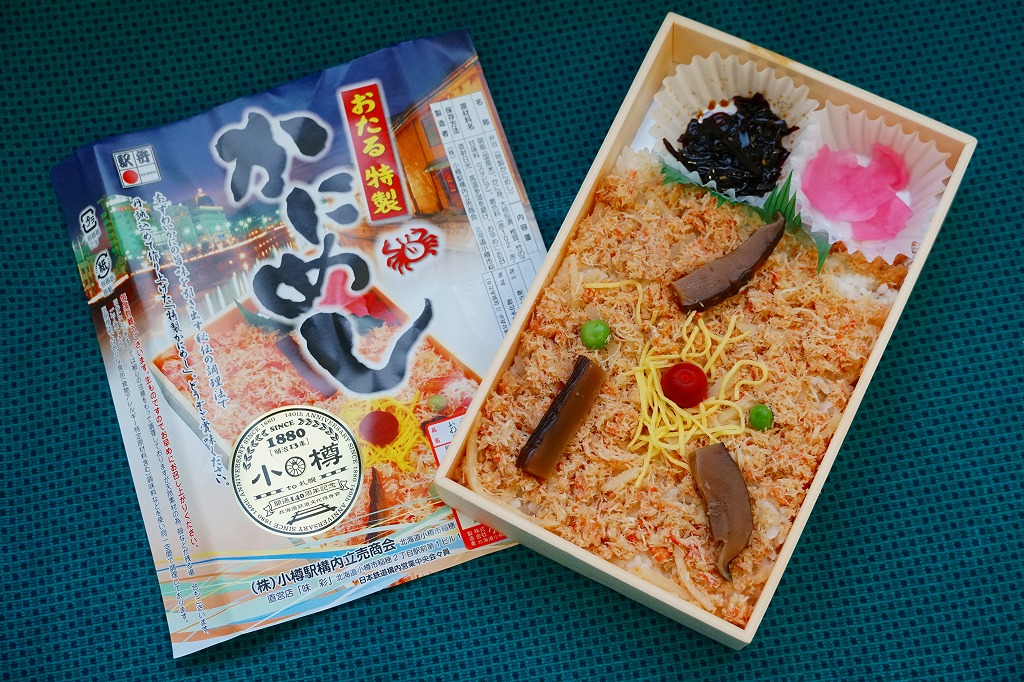通常のカニ飯駅弁の倍近い価格もあり、カニの風味はもちろん分量もたっぷり、これを食べたら普通に戻れないかもしれない。しかし残念ながらこの商品は、阪神百貨店の駅弁大会限定ながら小樽駅の駅弁を名乗る疑義駅弁だった模様。価格は2009年の購入時で1,890円、2014年4月の消費税率改定で1,950円。現存しない模様。