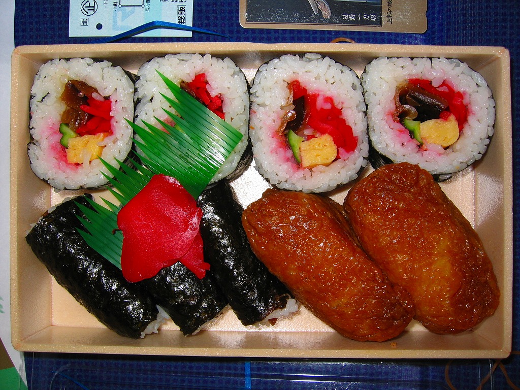 小樽駅の助六寿司駅弁。小樽の寿司といえば観光の名物だが、この駅弁はそうでなく、昔ながらの駅弁としての普通寿司。折箱に太巻4個、細巻3個、稲荷2個と紅生姜を詰めておしまい。他に同じ調製元で2種類の寿司があったが、掛紙があったのはこれだけで、他は見るからにスーパーの惣菜であった。価格は2004年の購入時で460円、2014年4月の消費税率改定で480円。2019年時点で存在しない模様。