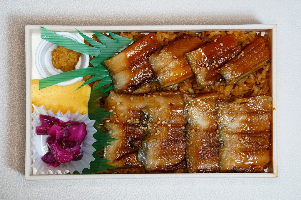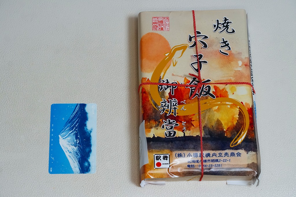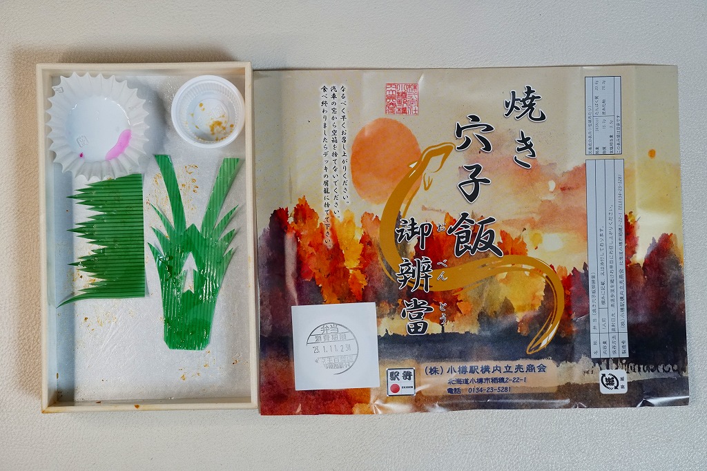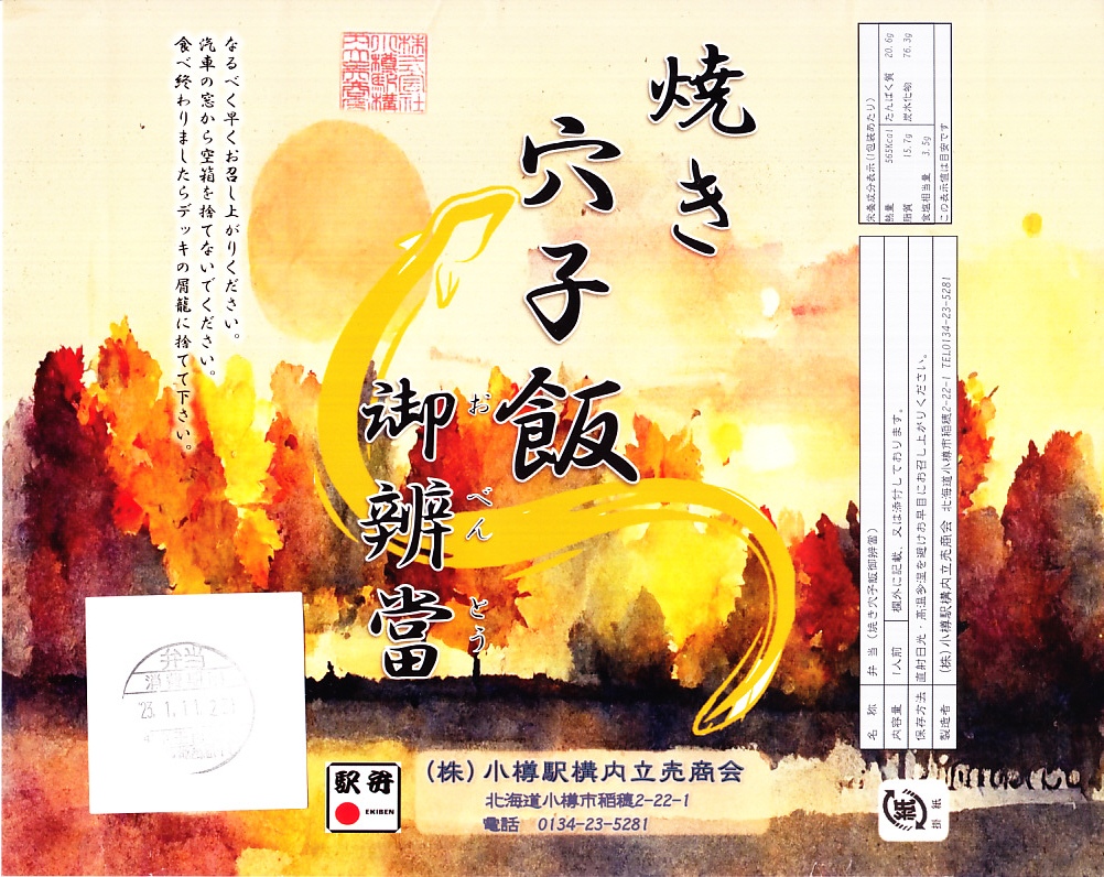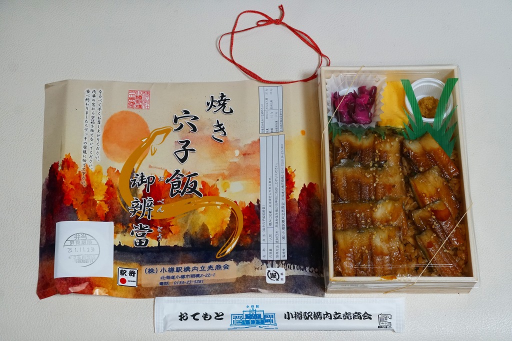2023(令和5)年1月の京王百貨店の駅弁大会で実演販売。本州や四国や九州で、特に瀬戸内海沿岸ではよくある、しかし北海道では身に覚えのない、穴子飯の駅弁。森駅「はもめし」以来、道内では約60年ぶりのアナゴ駅弁かもしれない。長方形の容器にタレ御飯を敷き、焼き穴子のタレ漬けで覆い、白ごまを振り、山わさび、玉子焼、柴漬けを添える。値段を気にしなければ、柔らかな身とタレや焼きの香りで、姫路駅その他瀬戸内海のアナゴ駅弁に負けないうまさ。今回の小樽駅弁の実演販売は、今までの海鮮一色を改め、焼き穴子、牛焼肉、豚丼を揃えて、印象を変えてきた感じ。どうも現地ではアナゴの半分を刻みアナゴに置き換えて1,050円で発売し、2024年時点で1,150円の商品らしい。