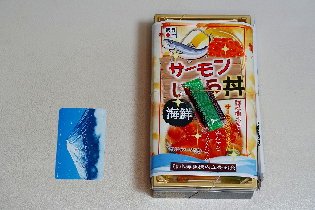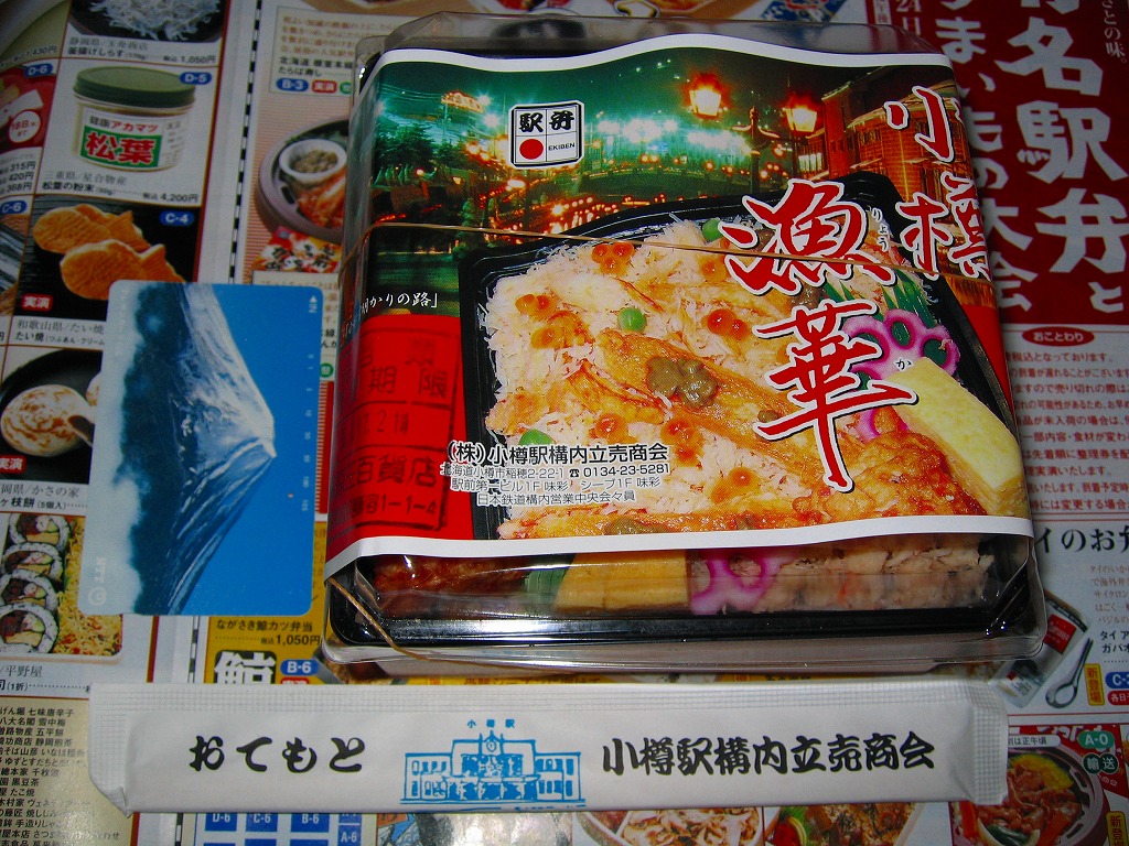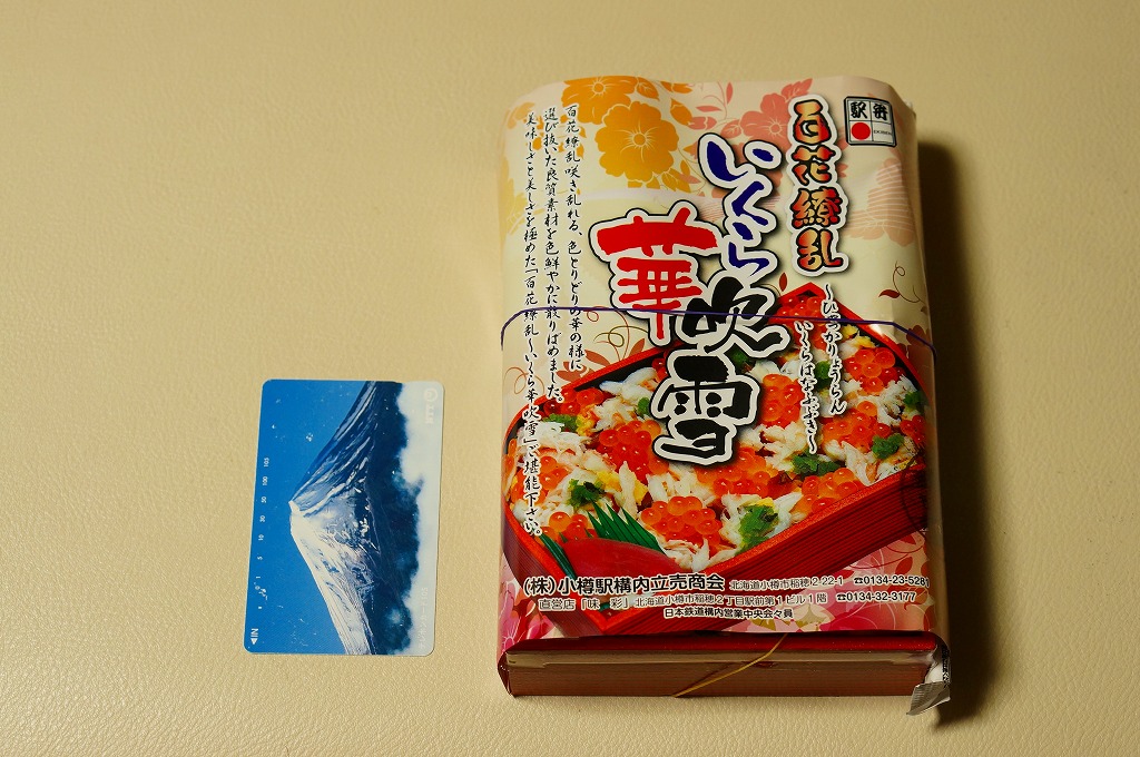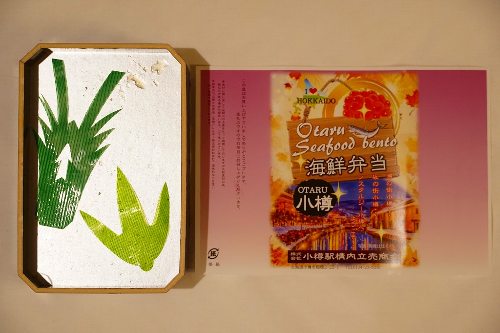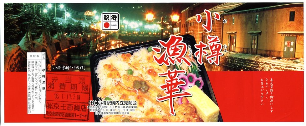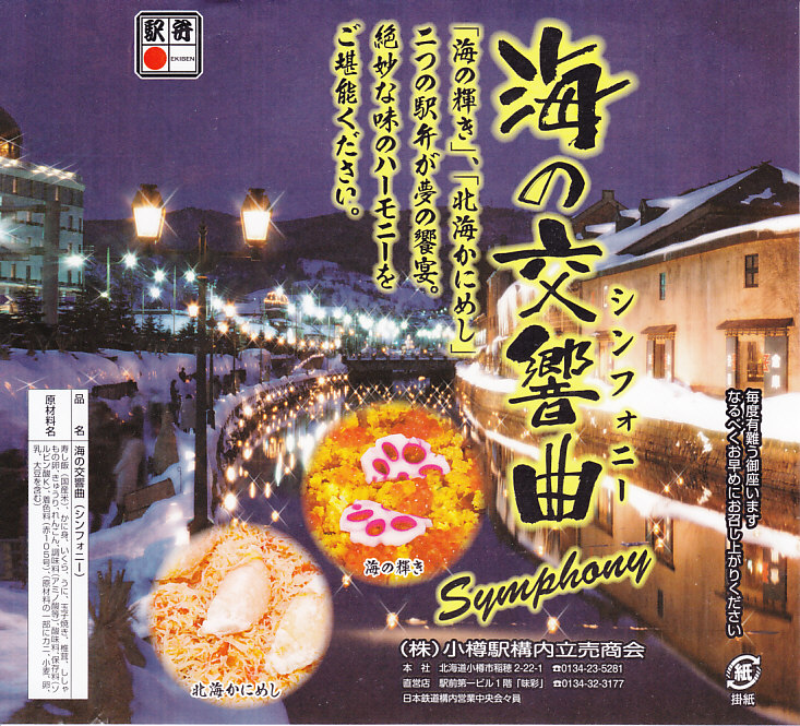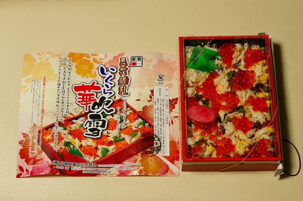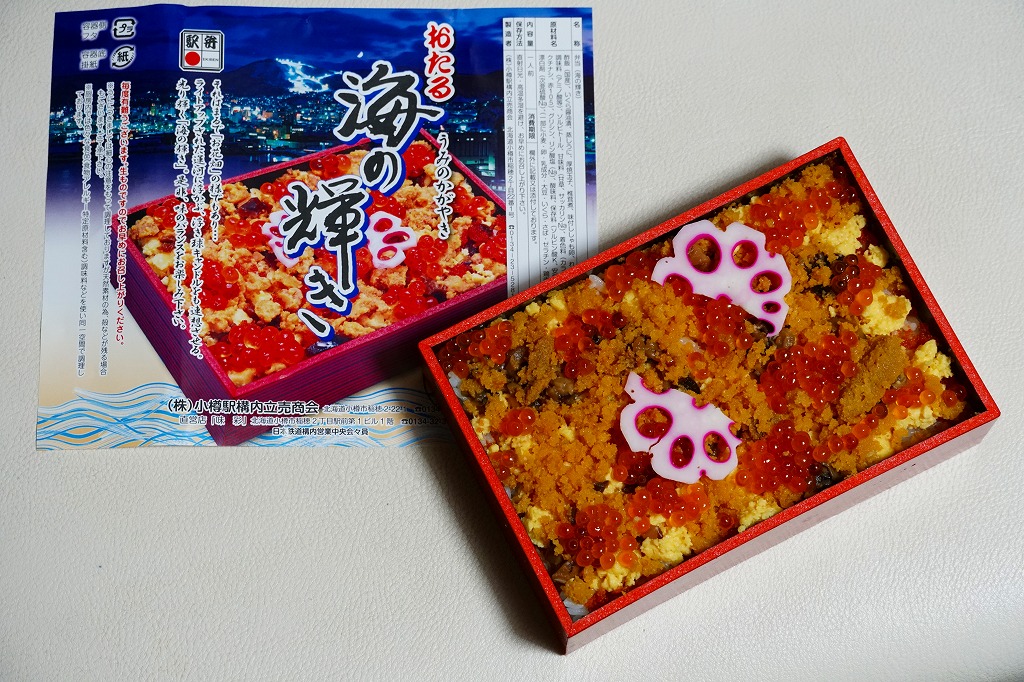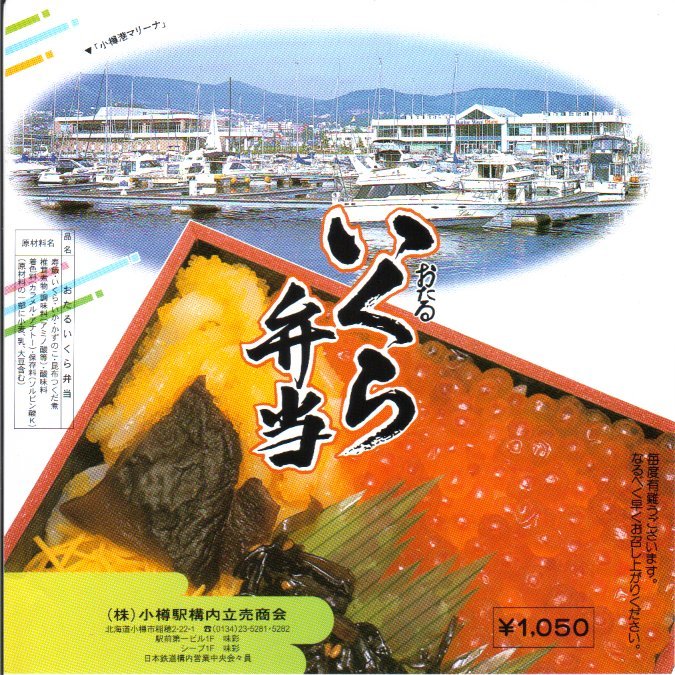 正方形の容器に、中身と小樽の町の写真を印刷した、容器をはみ出すくらい大きめの掛紙をかけて、割り箸とともに輪ゴムで留める。中身は掛紙と具の配置が異なるが素材は同じ、カズノコを和えたイカソーメンにイクラなどを御飯の上に載せたもの。なぜかこの駅弁にだけ、掛紙に駅弁マークが付いていない。