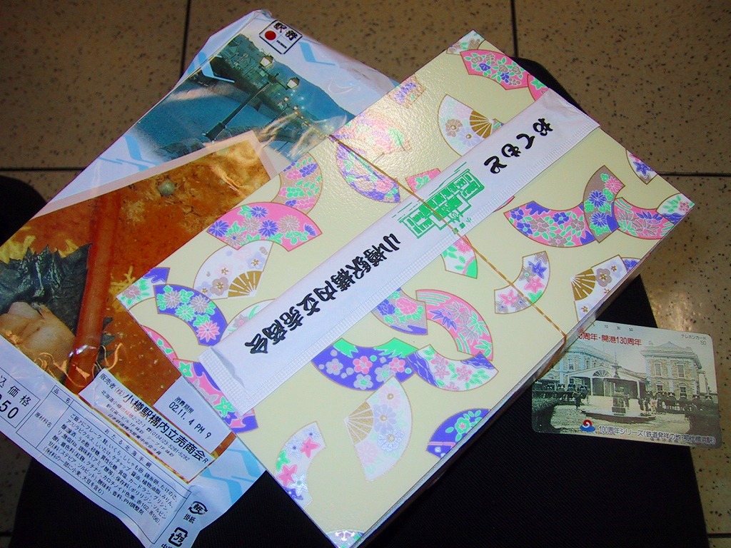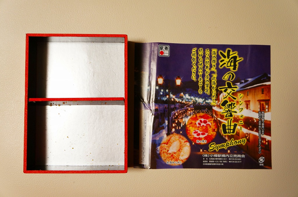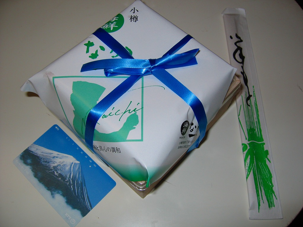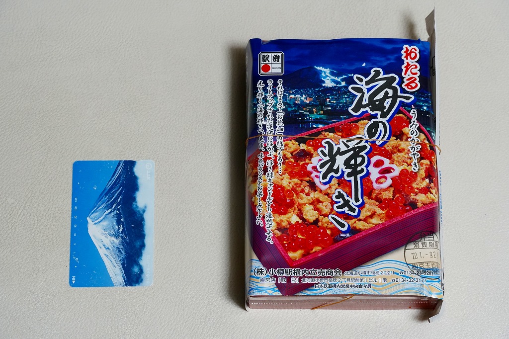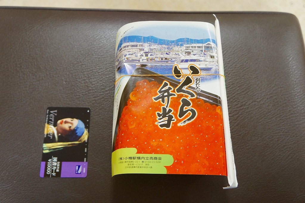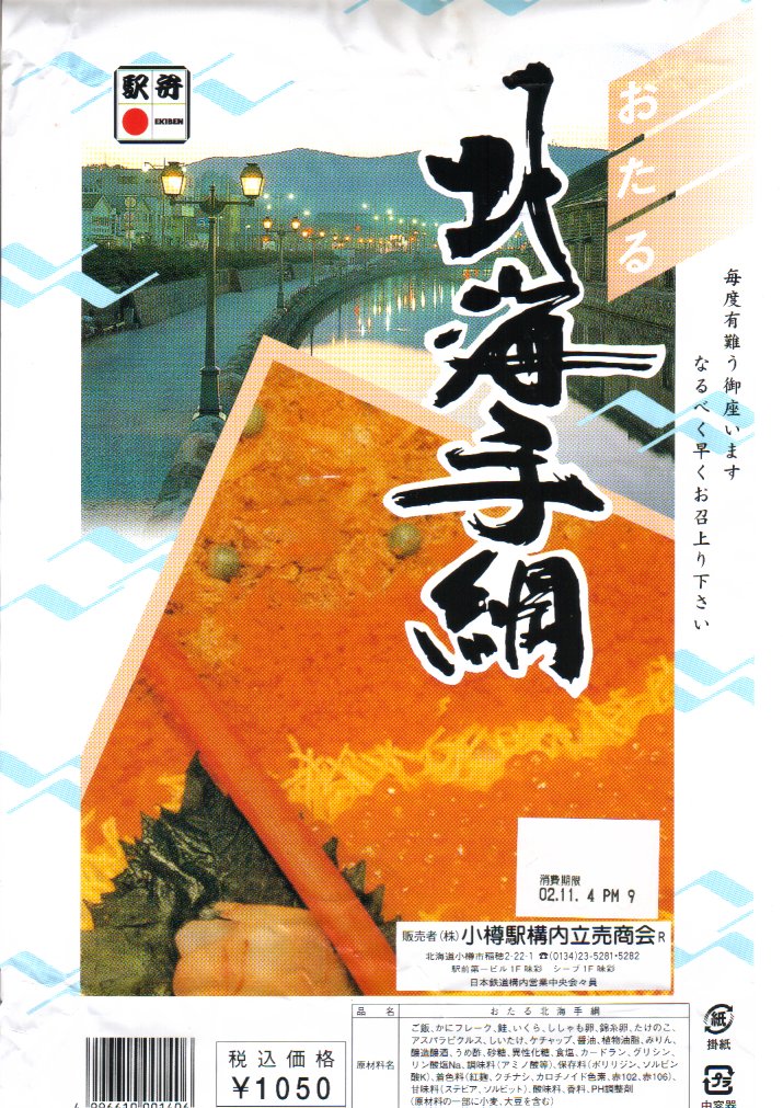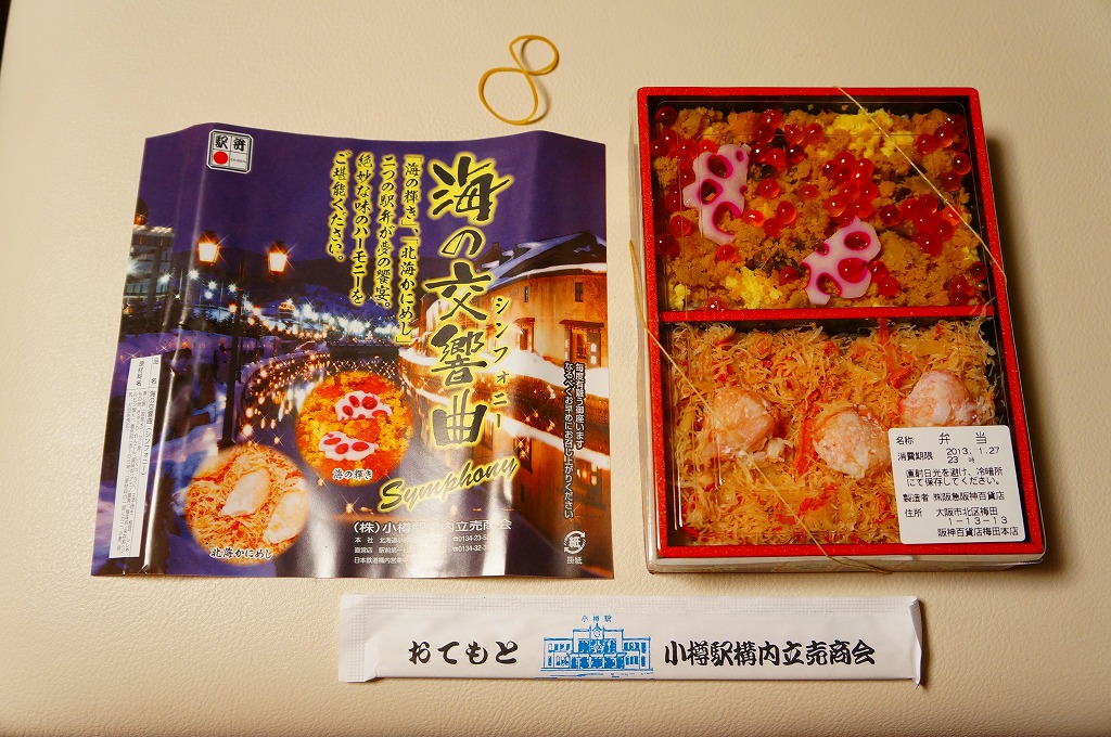 正方形の容器に、中身と小樽の町の写真を印刷した、容器をはみ出すくらい大きめの掛紙をかけて、割り箸とともに輪ゴムで留める。中身は掛紙と具の配置が異なるが素材は同じ、カズノコを和えたイカソーメンにイクラなどを御飯の上に載せたもの。なぜかこの駅弁にだけ、掛紙に駅弁マークが付いていない。