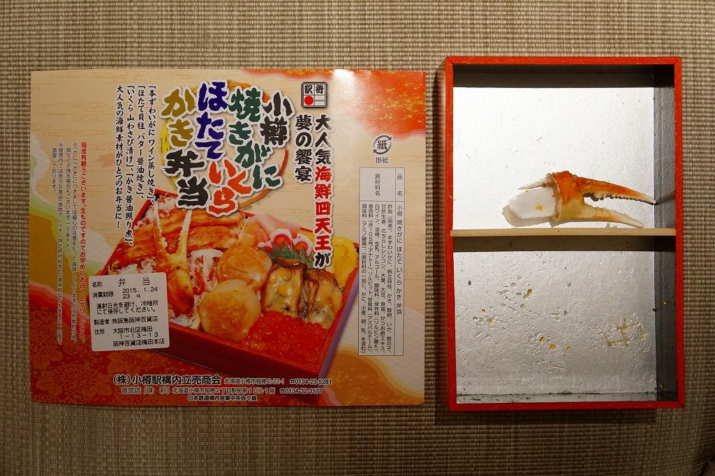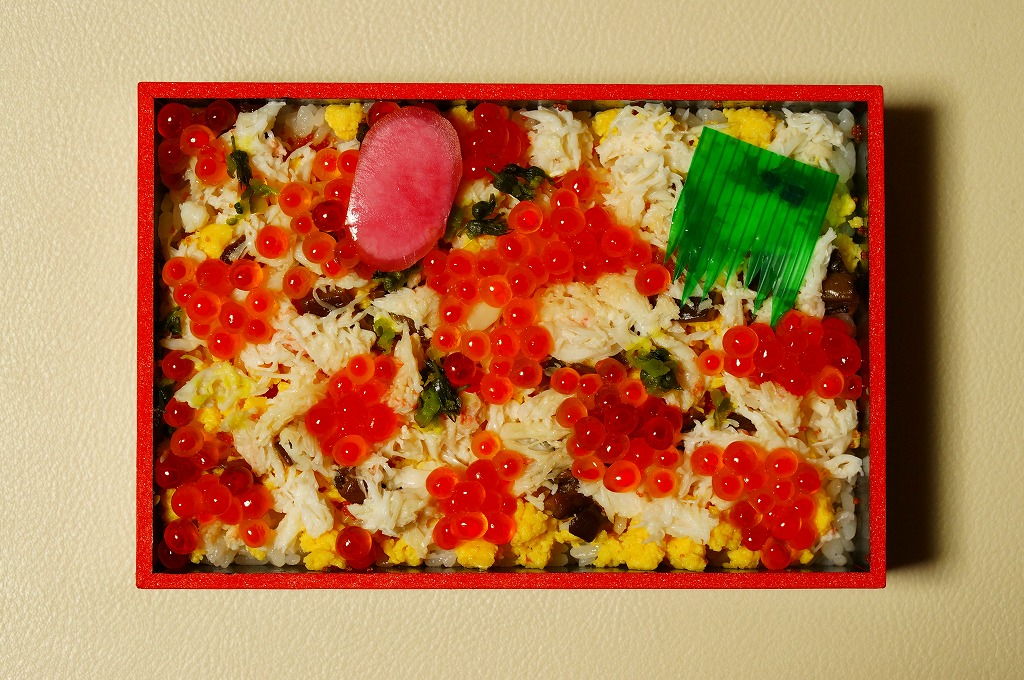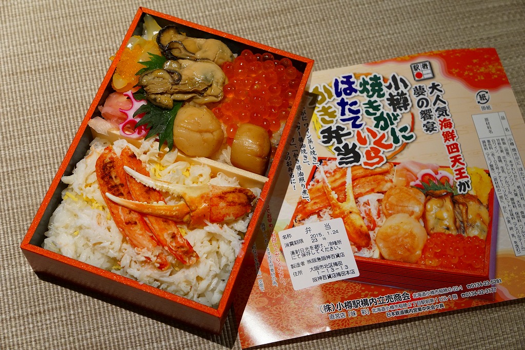 2015(平成27)年1月の阪神百貨店の駅弁大会で実演販売されたお弁当。商品名や掛紙の見本写真のとおり、2区画の酢飯の片側をカニほぐし身と焼きがにとカニ爪、片側をホタテ貝柱とイクラとカキ煮にイカやカズノコや甘酢生姜で覆った、豪華で賑やかなお弁当。北海道物産展の海鮮弁当の味を駅弁らしく平面に展開したものの、見るからに駅売りやキヨスク扱いに適さない具のセレクトに思えたし、実際にこの駅弁大会でしか売らない疑義駅弁であった模様。