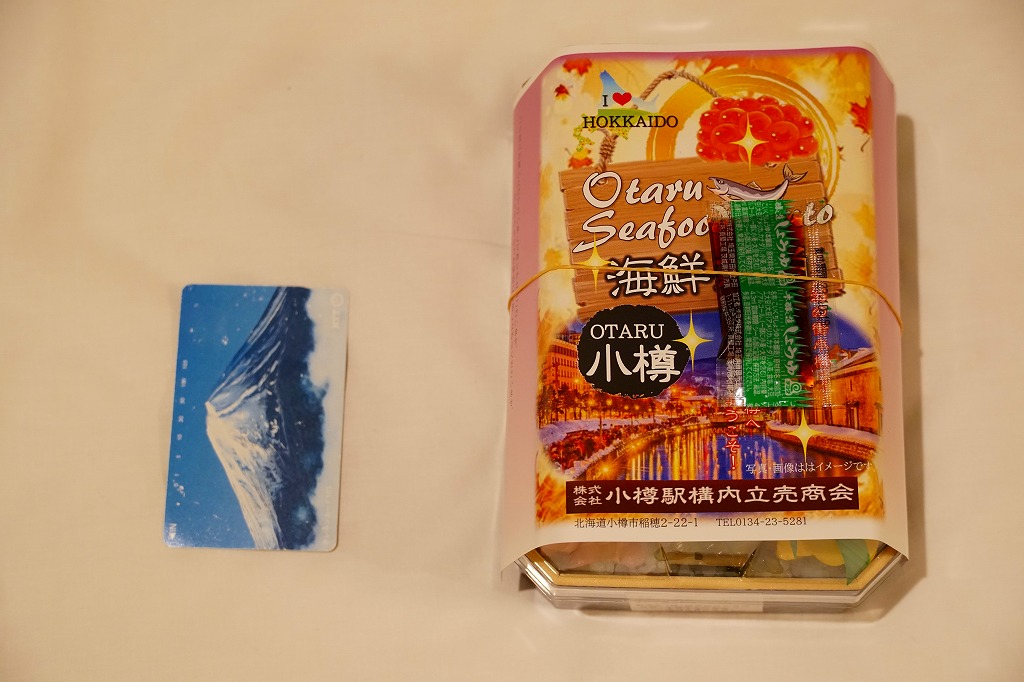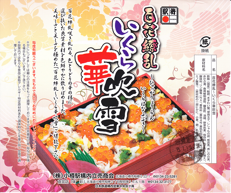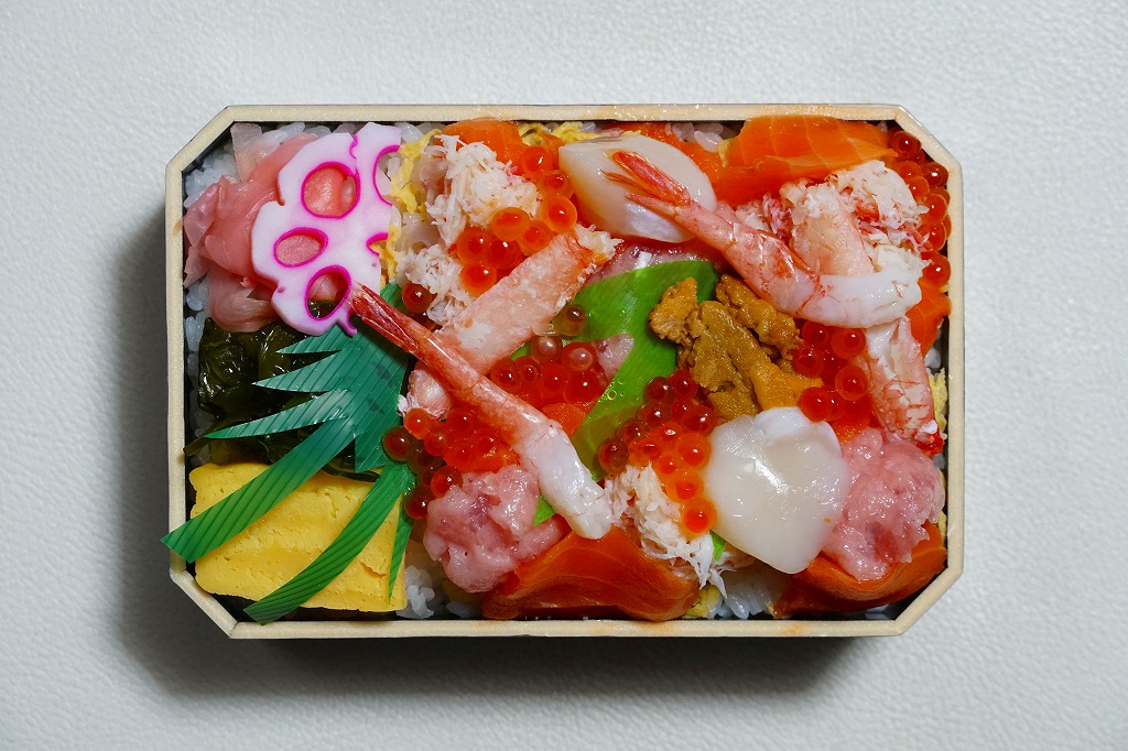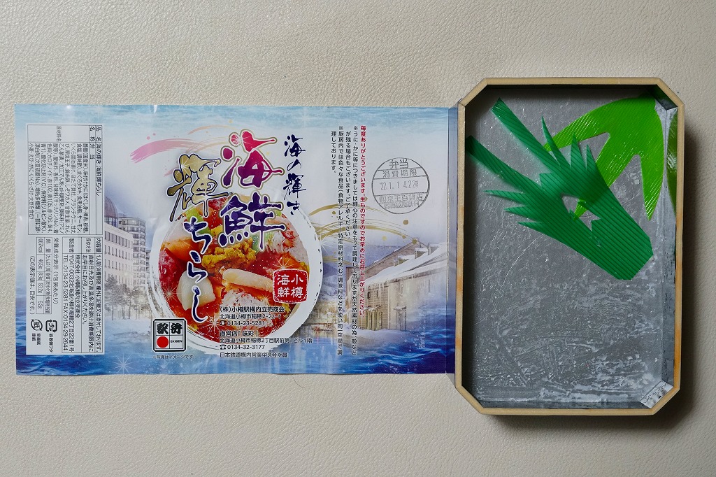 2023(令和5)年1月の阪神百貨店の駅弁大会で、小樽駅の駅弁として実演販売。上げ底と上げぶたが極端な、北海道物産展や駅弁大会などの催事向け容器に、酢飯を薄く敷き、ホタテ、サーモン、まぐろ、昆布、玉子焼、ガリを盛り付け、イクラとワサビと花れんこんとバランで彩る。見栄え重視の惣菜で、内容や風味はデパ地下の寿司や物産展の海鮮丼と同じようなもの。これが小樽駅で買えるとは思えないがどうか。百貨店の公式サイトの駅弁一覧にも掲載されなかった商品。