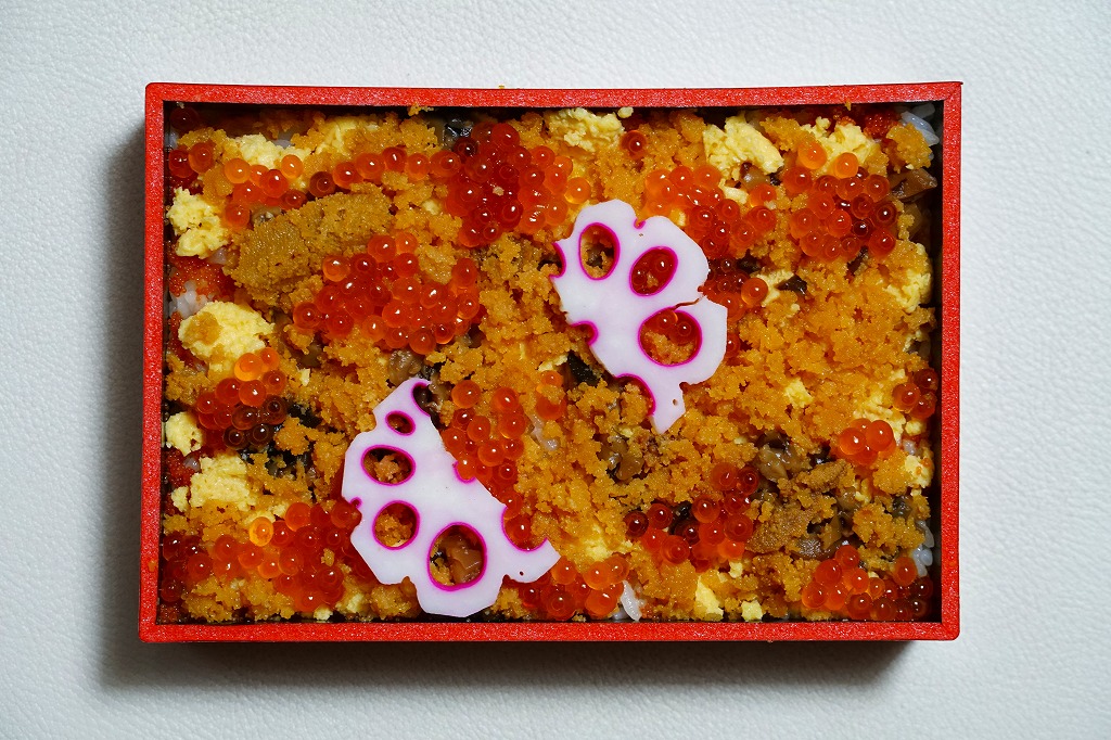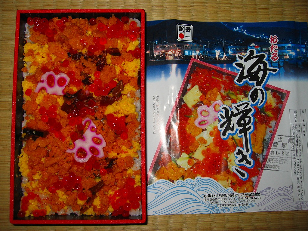 リクルートが北海道内で発行する月刊旅行情報誌「じゃらん北海道発」とのタイアップで、2003(平成15)年の9月から12月まで道内の8駅で各1種類が販売された「新・ローカル駅弁」の、小樽駅バージョン。その後も販売が続き、小樽駅を代表する駅弁となった。小樽駅の他の名物駅弁と同じ、柄物の底が浅い長方形の容器を使用、透明なふたをかけ、フルカラーの掛紙で覆う。中身は酢飯の上にウニやイクラや玉子焼やキュウリをちりばめて、蓮根でアクセントをつけるもの。その輝きは掛紙の見本写真よりも強く美しい。