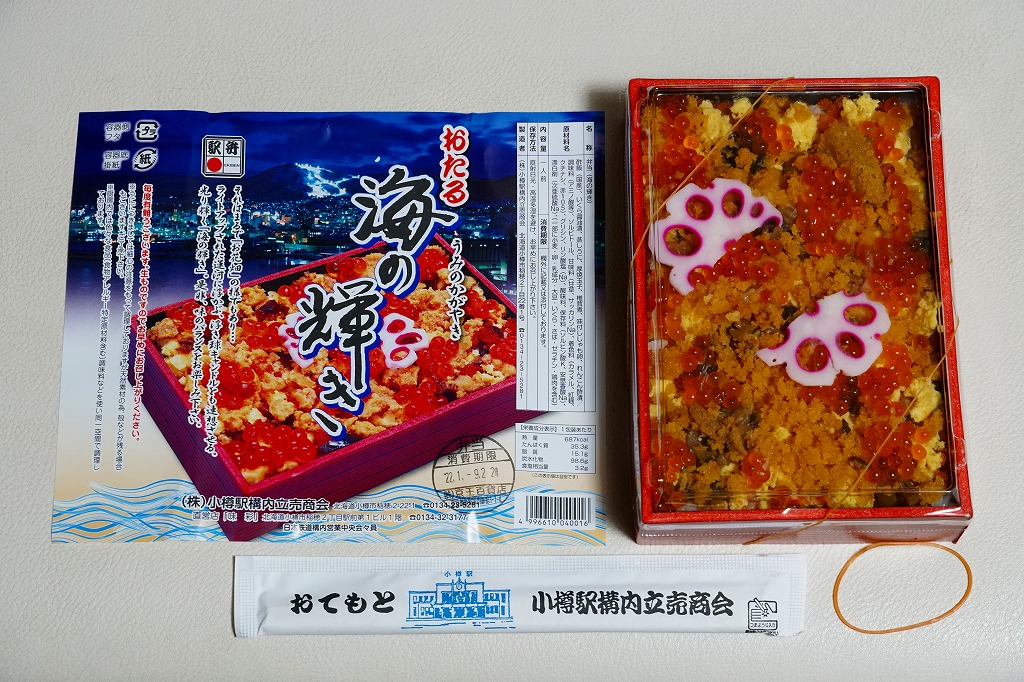2022(令和4)年1月の京王百貨店の駅弁大会で、小樽駅の駅弁として実演販売。翌月の鶴屋百貨店の駅弁大会でも実演販売。催事で人気を集めた小樽駅弁「おたる海の輝き」の上位版だろう。かなりの上げ底でふたを盛り上げた、催事向け海鮮弁当向け容器に、酢飯を薄く敷き、カニほぐし身、カニ棒肉、マグロたたき、サーモン、いくら、ホタテ、うに、甘えび、玉子焼、錦糸卵、わかめ、甘酢生姜、れんこんを盛り付けた。7種類の海鮮が盛りだくさんとする。北海道物産展などでありがちな海鮮丼に、ネギトロのようなものを加えたことで、香りと口当たりが柔らかくなったと思う。小樽駅で売られるかは分からない。価格は2022年時点で2,160円、2023年1月の京王百貨店の駅弁大会では2,376円。