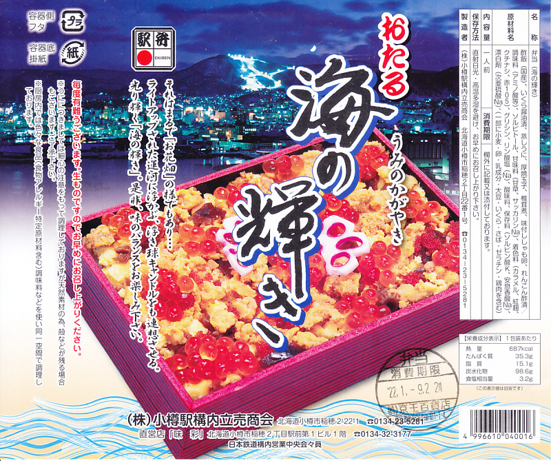 2015(平成27)年1月の京王百貨店の駅弁大会での実演販売でデビュー。同年4月の仙台駅でのNREの駅弁大会でおそらく輸送販売。これ以外で売られた買えたという話を見聞きしたことはないが、10月のJR北海道の車内誌には小樽駅弁として登場している。このページで紹介した過去の商品と同じく、酢飯の上にイクラ、カニ、玉子焼、シシャモ卵、シイタケ煮、青シソ漬などを散らす。あるいは「おたる海の輝き」のウニをカニに替えて新作にしたものか。その違いにより、風味も食感もより柔らかくなった印象。値段は2015年の購入時で1,380円、2020年時点で1,580円。2022年までの販売か。