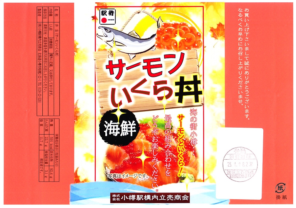 2023(令和5)年1月18日に購入した、小樽駅弁の掛紙。上記の2022年のものと同じ。この年は京王百貨店と阪神百貨店の駅弁大会で実演販売。小樽や小樽駅で買えるかどうかは分からない。
