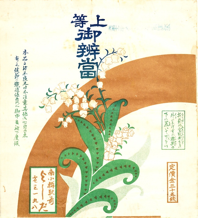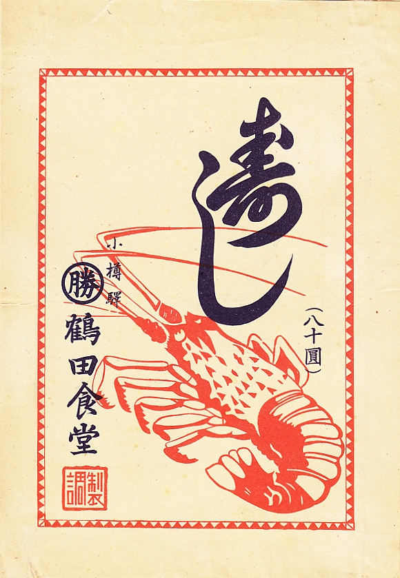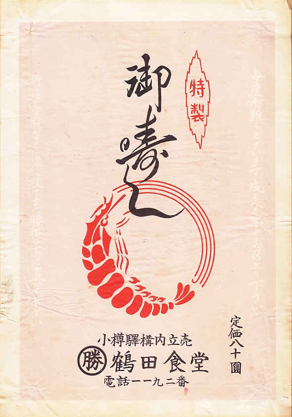 1950年代、昭和30年前後のものと思われる、昔の小樽駅弁の掛紙。収集者は1953(昭和28)年4月10日の調製としていた。北海道では獲れないイセエビを描いたように見える。小樽は当時有数の貿易港として遠方から何でも手に入れられたと考えるのは空想が過ぎるか。鉄道に関する注意書きなどがないため、駅弁でなく駅前食堂が折詰に使う掛紙かもしれない。