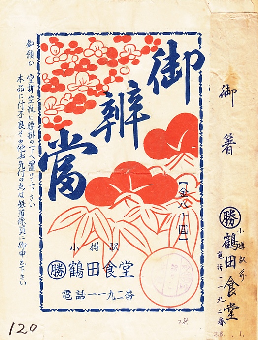 1953(昭和28)年3月1日の調製と思われる、昔の小樽駅弁の掛紙。収集者が箸袋とともに、スクラップブックに貼り付けた。小樽の何かを表したり描いたわけではないように見える。