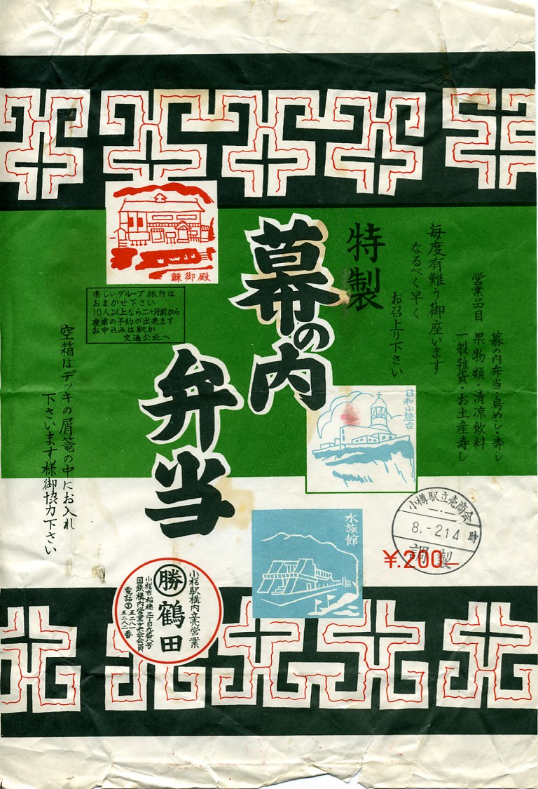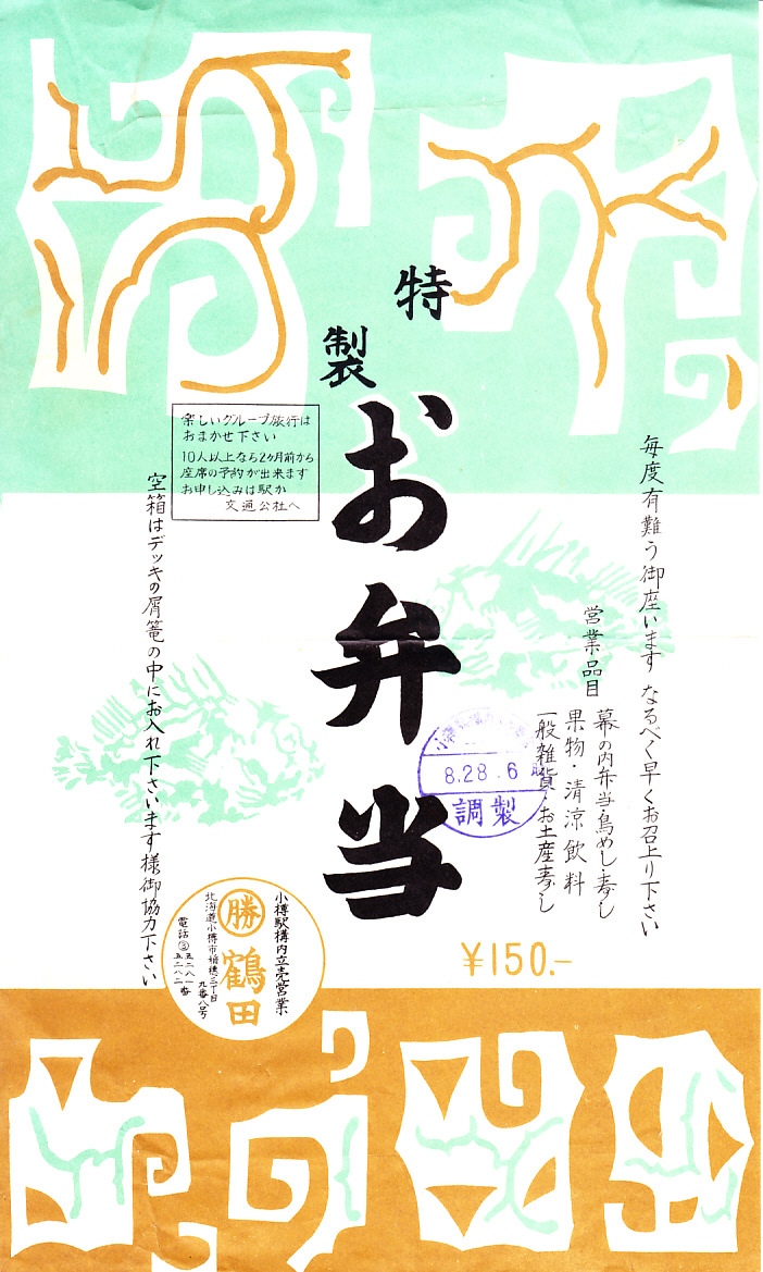 昭和40年代頃の、8月2日14時の調製と思われる、昔の小樽駅弁の掛紙。小樽市の市内局番が2桁になった1972年頃より前のものか。鰊御殿、日和山燈台、水族館が簡単なスタンプのようなイラストで描かれる。小樽が観光地として認識されるのは1990年代に入ってからだと思うし、その目玉である運河はここに登場しない。