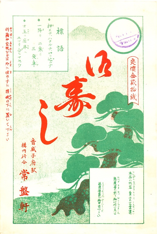 1929(昭和4)年11月の調製と思われる、昔の音威子府駅弁の掛紙。こんな枝ぶりの松は道北には生えていないと思う、お寿司のイメージイラスト。