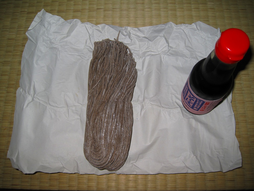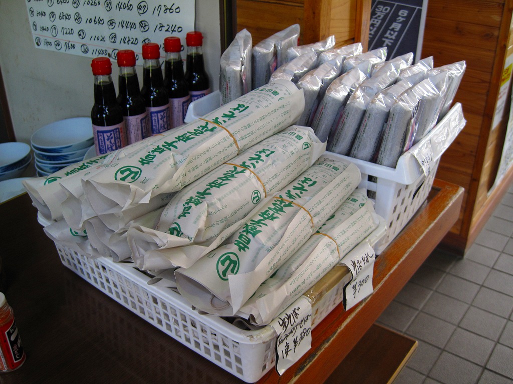 音威子府駅舎内の立ち食いそば店で売られていた生麺。包装紙で麺を直接包んで、輪ゴムで留めるだけ。駅で実際に使われている畠山製麺のそばなので、瓶入りの温そば用濃縮つゆ(300円)も買い、自宅で調理してみると、現地で食べたものと同じ味を再現できた。2021年2月に駅そば屋は閉店してしまったが、これは村内のどこかで買える気がしている。