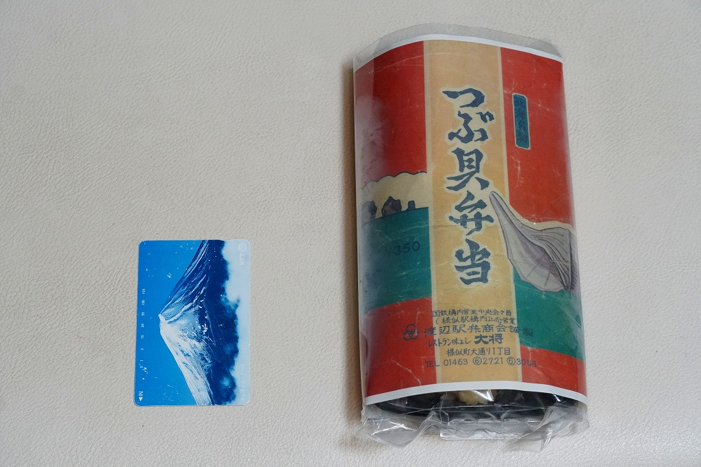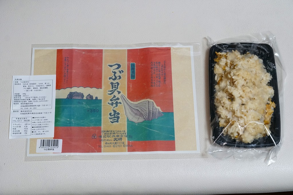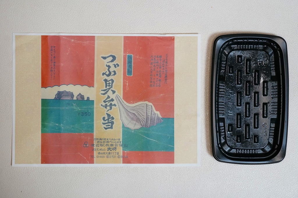 掛紙は現役当時のものをカラーコピー。容器は現地の掲示や通販サイトの掲載では黒塗りの重箱であるが、ここでは冷凍食品の通信販売で黒いプラ製トレー。その中につぶ貝の混ぜ御飯だけを詰める。貝の飯なのに臭みも固さもない、滋味あふれる感じ。イベントの終了後も、かつての駅舎に入居した観光案内所で、冷凍食品として予約販売される。カラーコピー掛紙だけの販売もある。